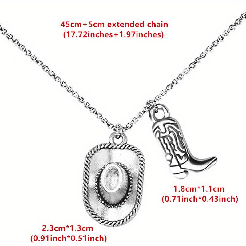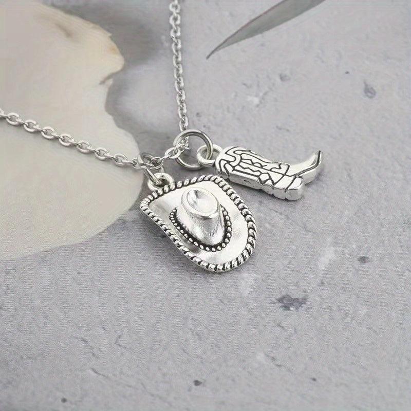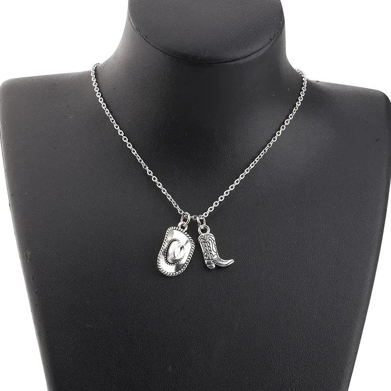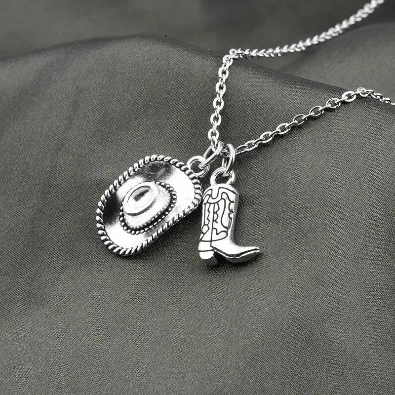 Complete your party or punk look with this stylish cowboy hat and cowgirl boots pendant necklace. Made with antique silvery finish, this unique piece of jewelry is perfect for women.