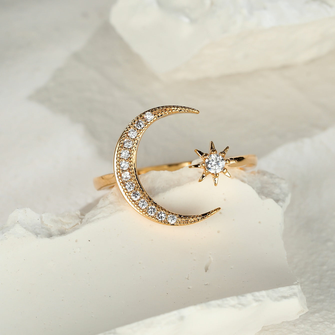 This 18K plated ring features a cresent moon design with Zircon inlay, perfect for girls. It's a stylish accessory that adds a touch of elegance to any outfit.