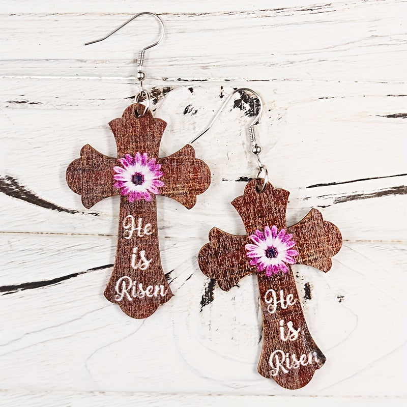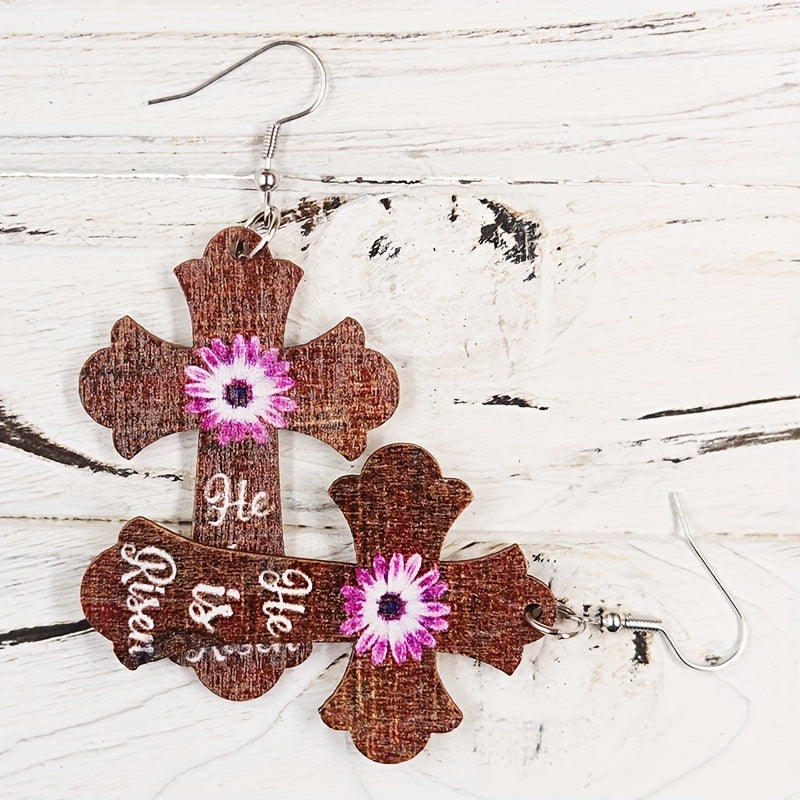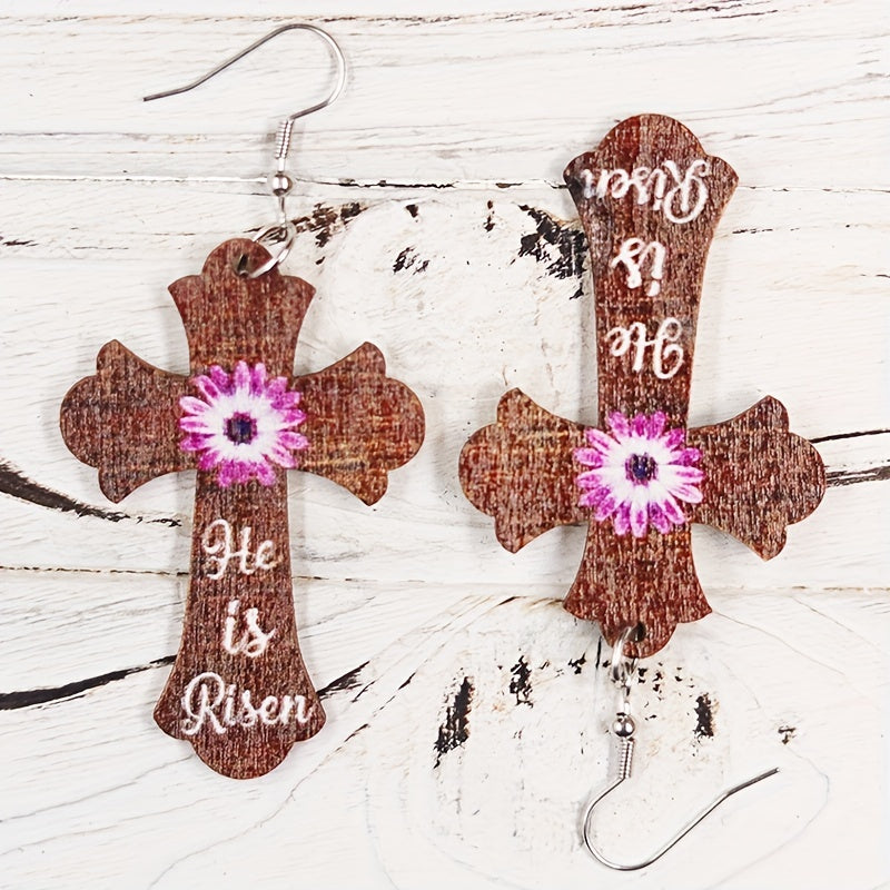 Add a touch of retro style to your look with these unique wooden earrings featuring a cross and flower print design. Perfect for daily wear and special occasions.