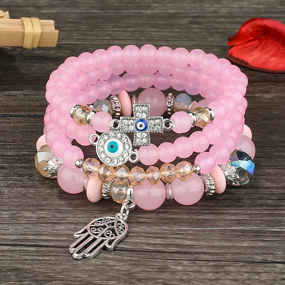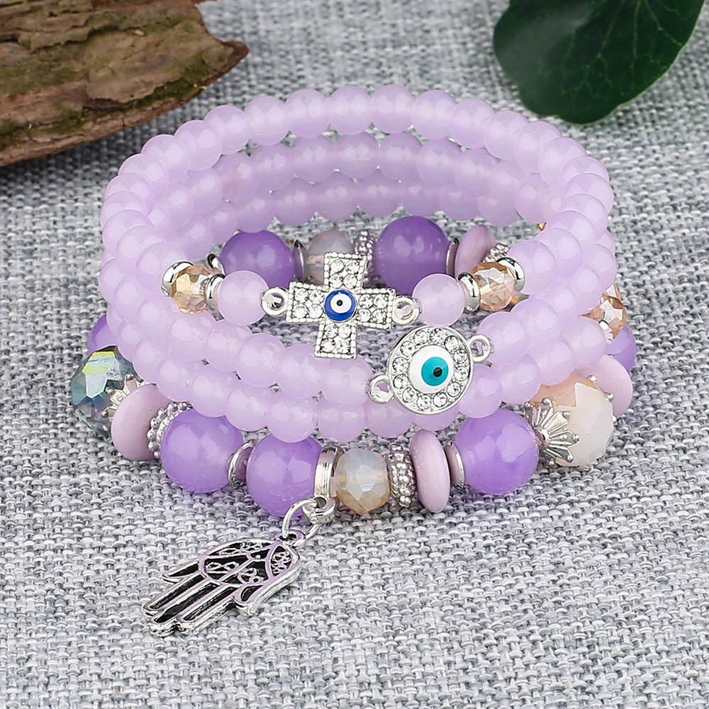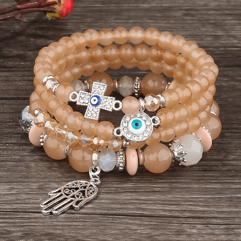 Add a touch of boho style to your look with this layered crystal beaded bracelet featuring a palm pendant. This bracelet is a trendy jewelry accessory that will elevate your outfit.