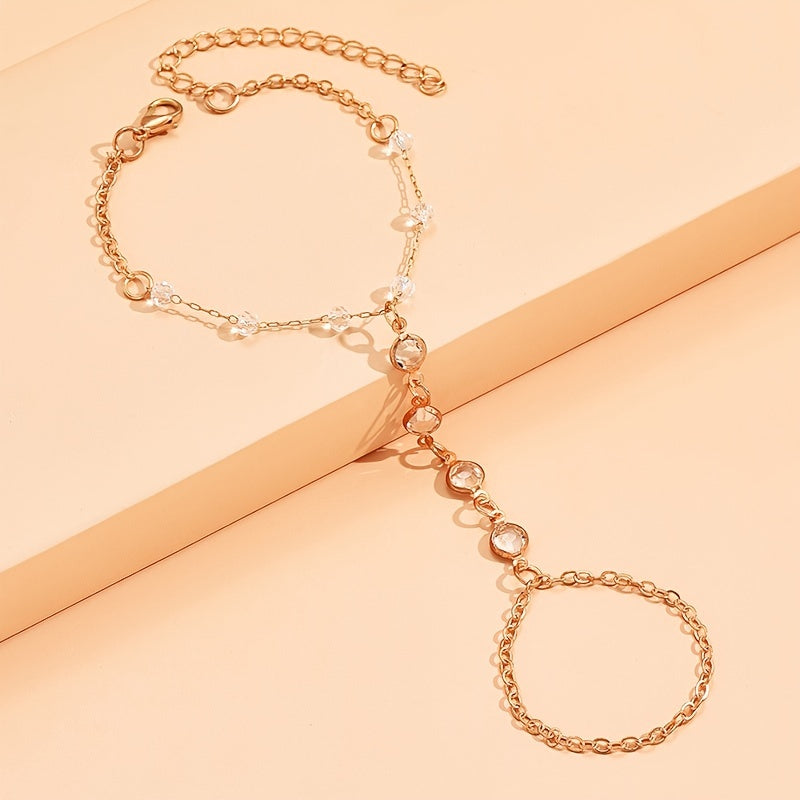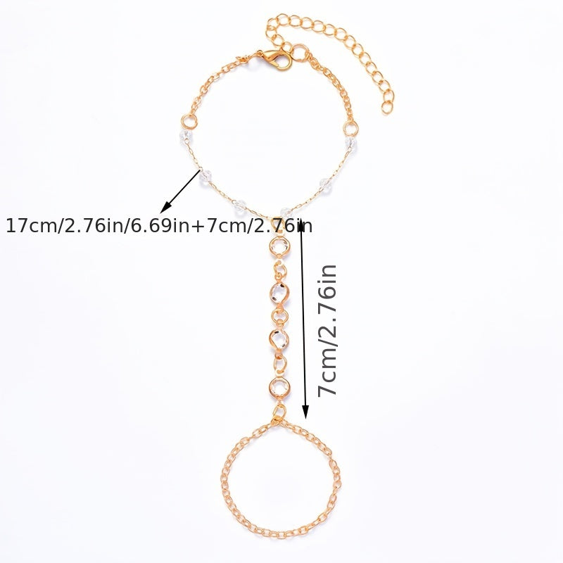 Elegant and stylish chain bracelet with crystal finger ring, perfect for weddings and special occasions. This boho hand accessory adds a touch of glamour to your outfit.