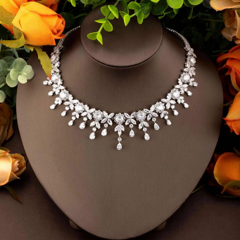 Elegant and sophisticated jewelry set featuring cubic zirconia flower inlays, perfect for bridal wedding wear. Includes a necklace, earrings, and ring for a complete set.