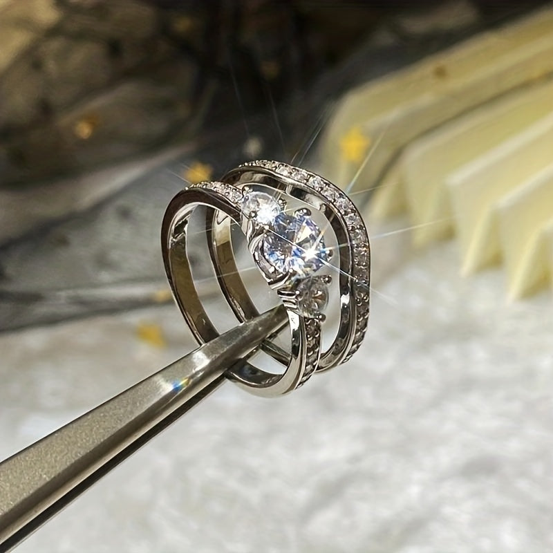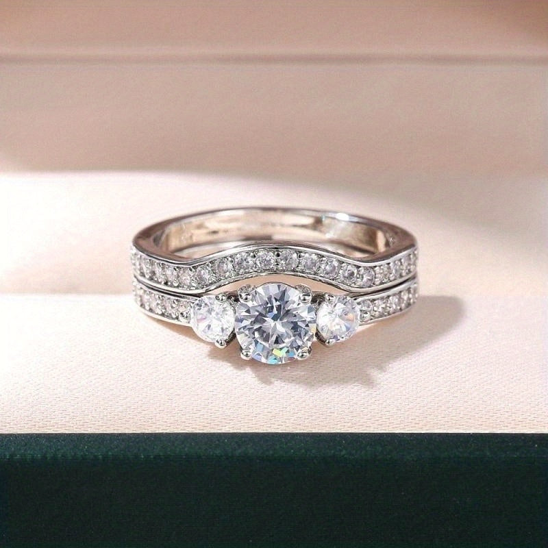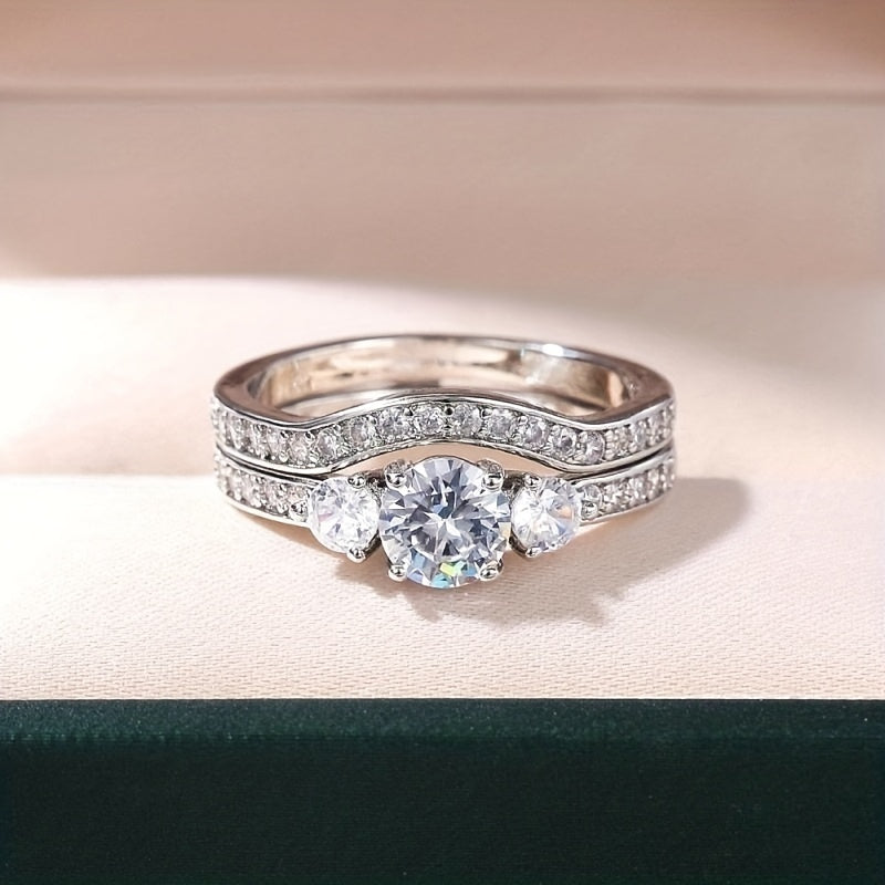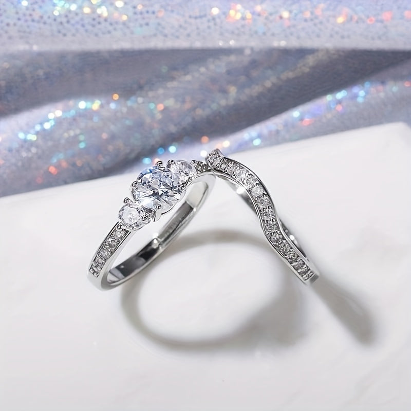 This 2-piece silver ring set features cubic zirconia stones, perfect for couples. Ideal for romantic engagement or as bridal wedding jewelry. Makes a thoughtful lover's gift.