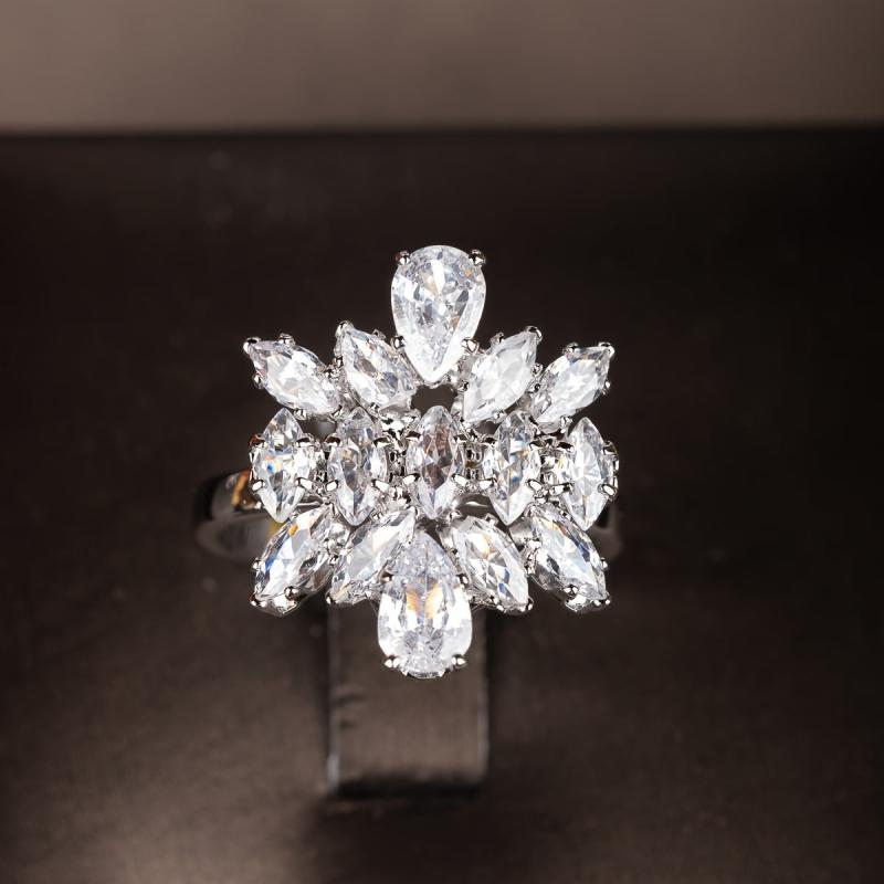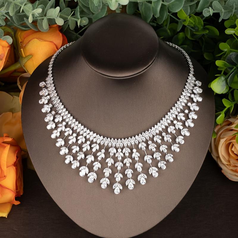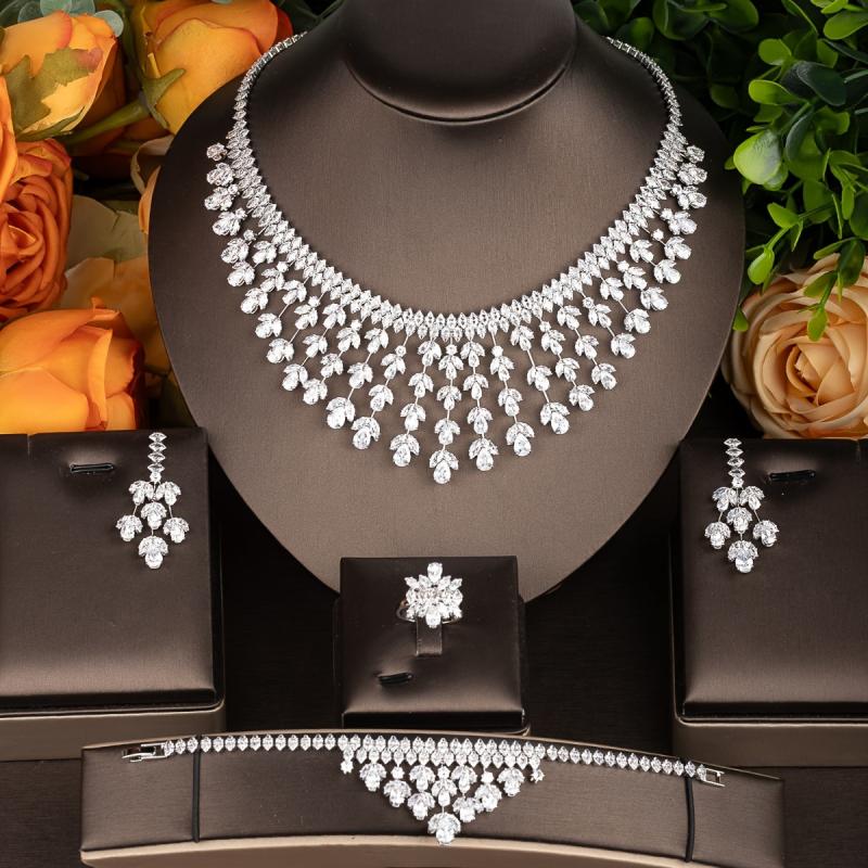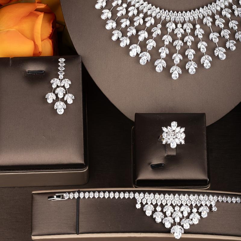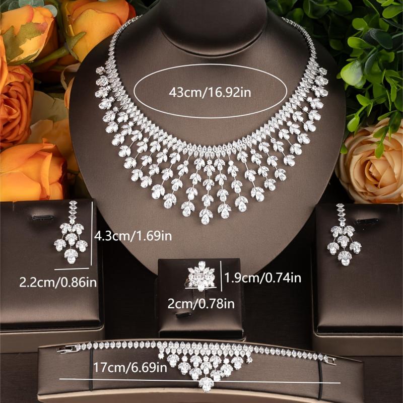 Elegant set of cubic zirconia drop inset necklace, bracelet, earrings, and ring; perfect for wedding wear.