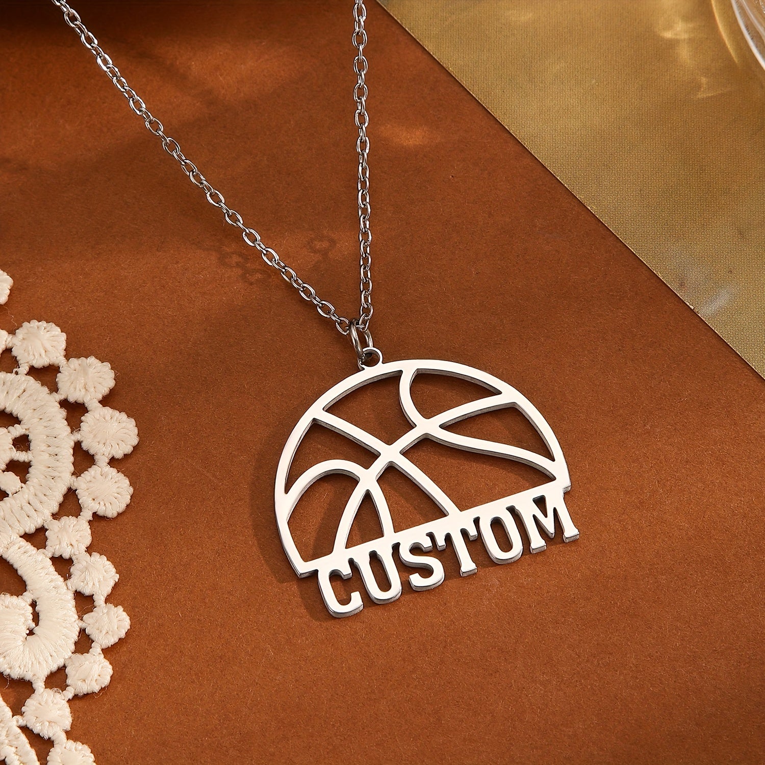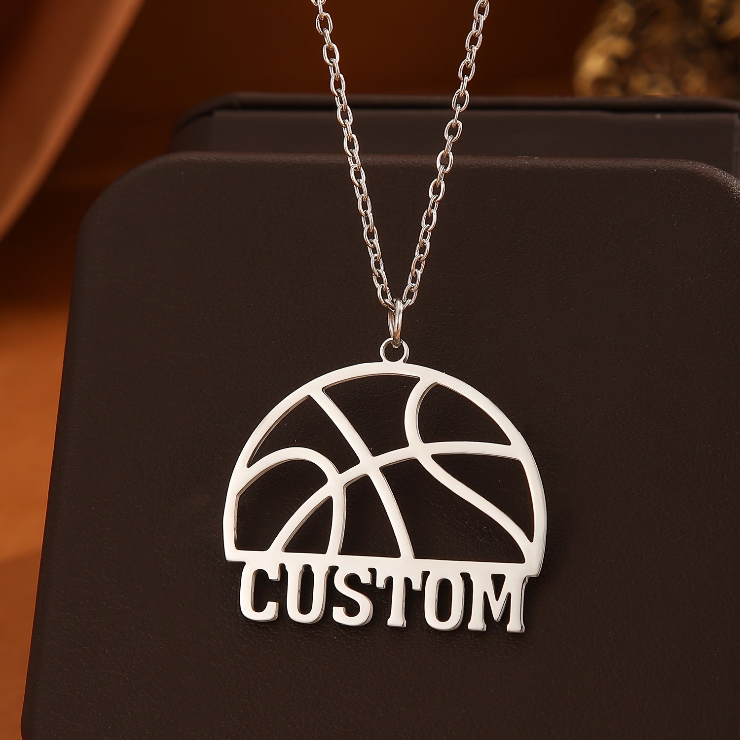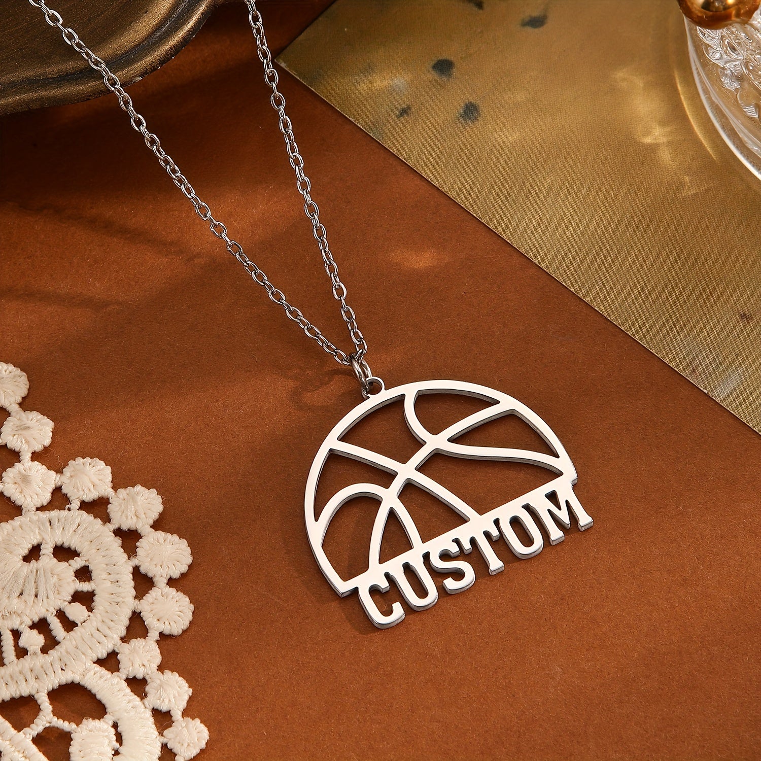 This pendant necklace features a hollow basketball design with customizable letters and names, perfect for sports enthusiasts. A unique and creative gift idea!