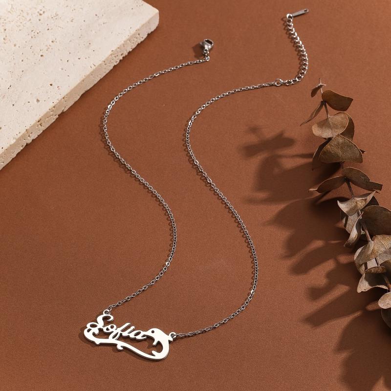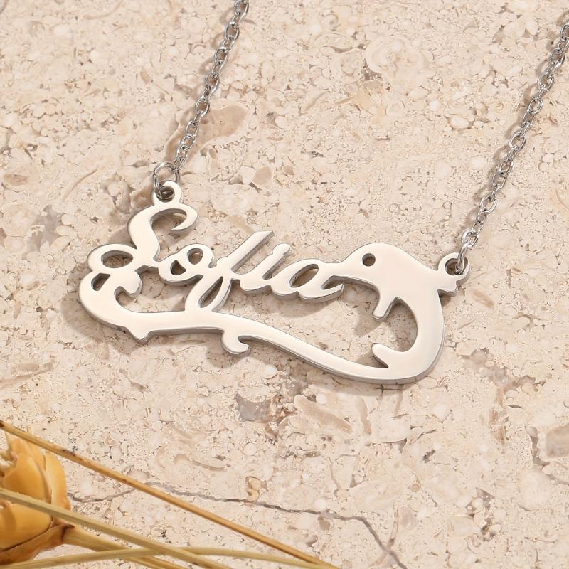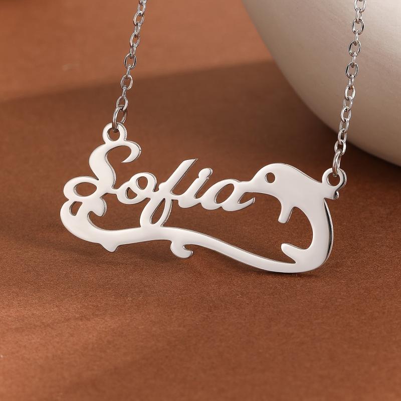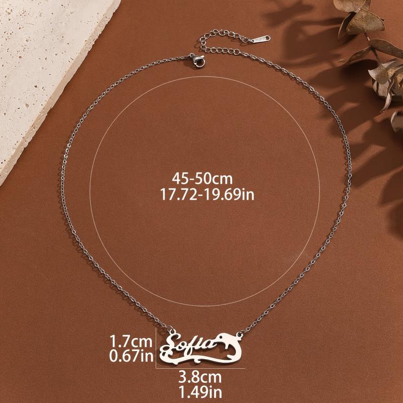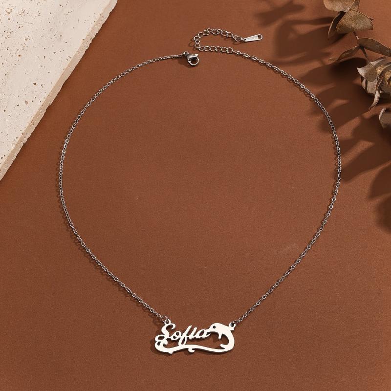 This personalized pendant necklace features a dolphin engraving and comes with a durable stainless steel chain.