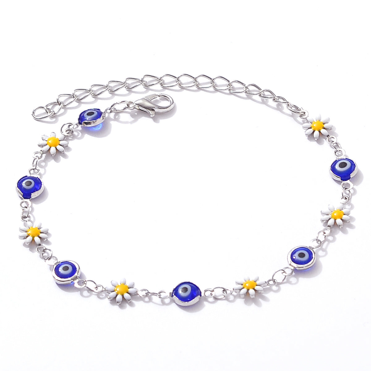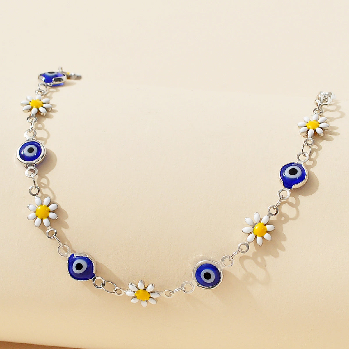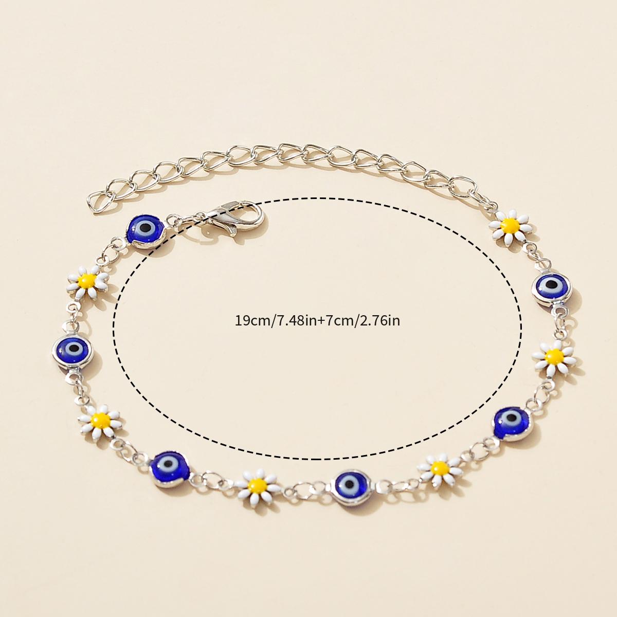 This stunning bracelet features small daisies and a devil's eye charm. Perfect gift for women, wife, girls, or her on birthdays or special occasions.