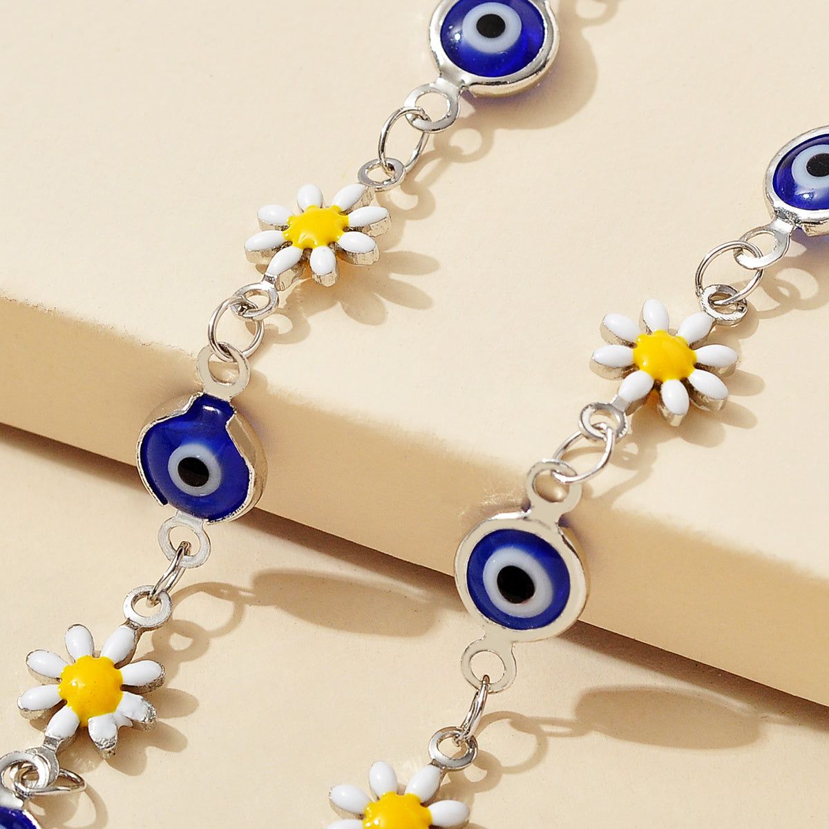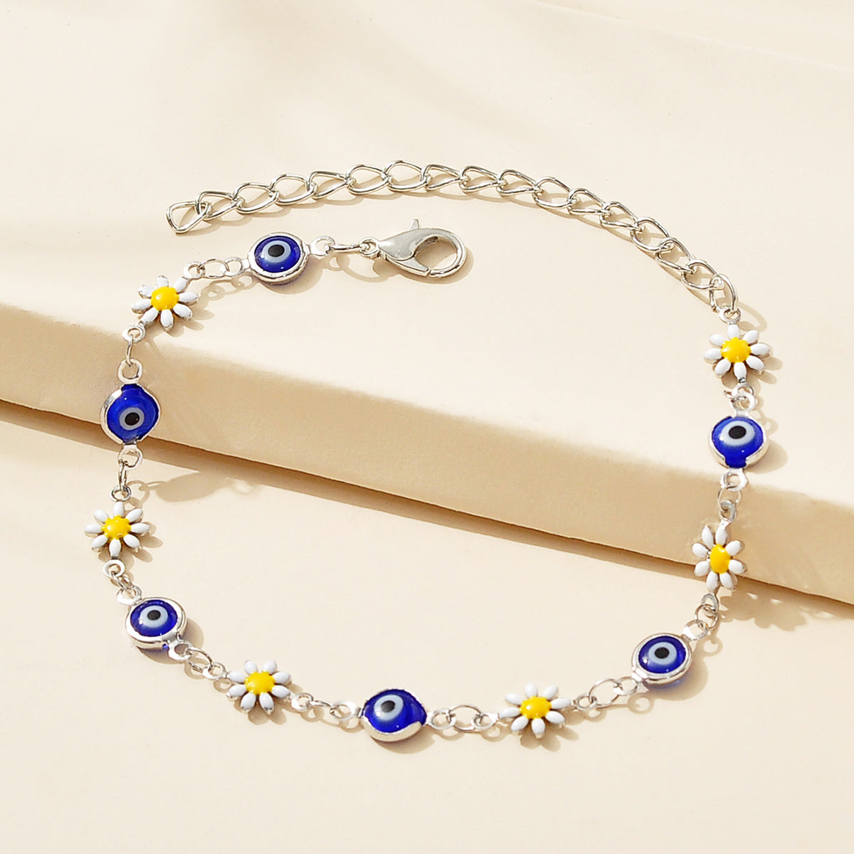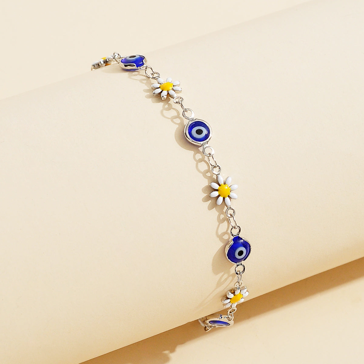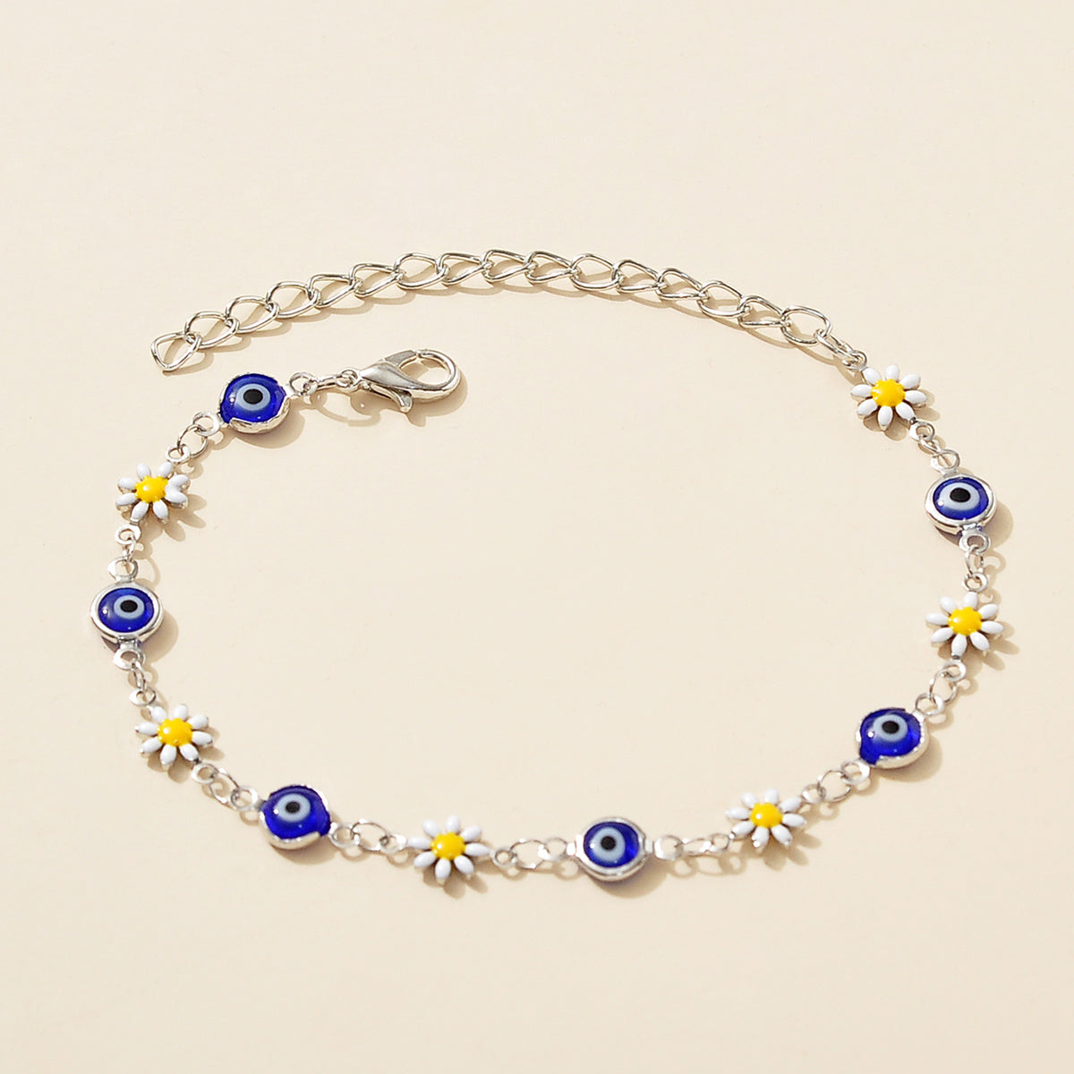This stunning bracelet features small daisies and a devil's eye charm. Perfect gift for women, wife, girls, or her on birthdays or special occasions.
