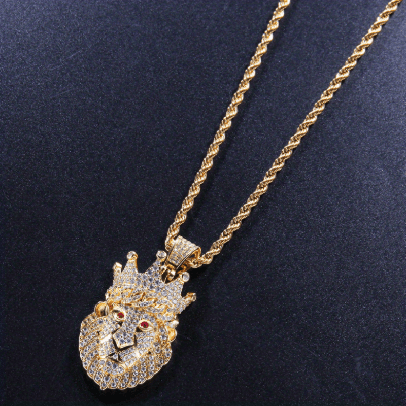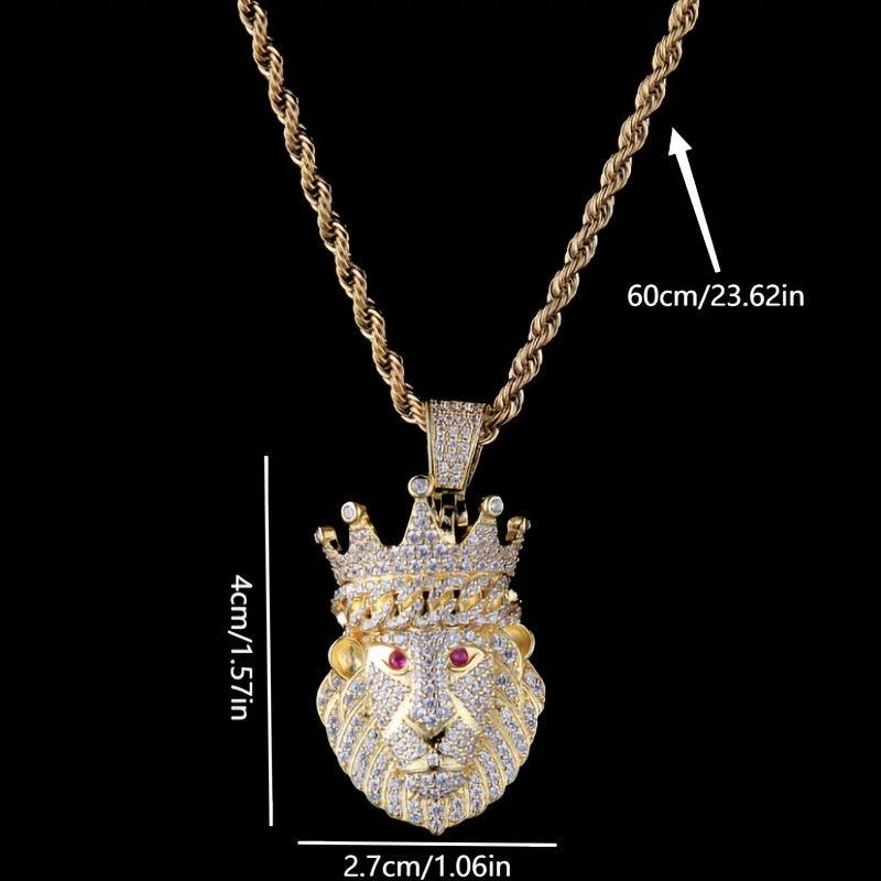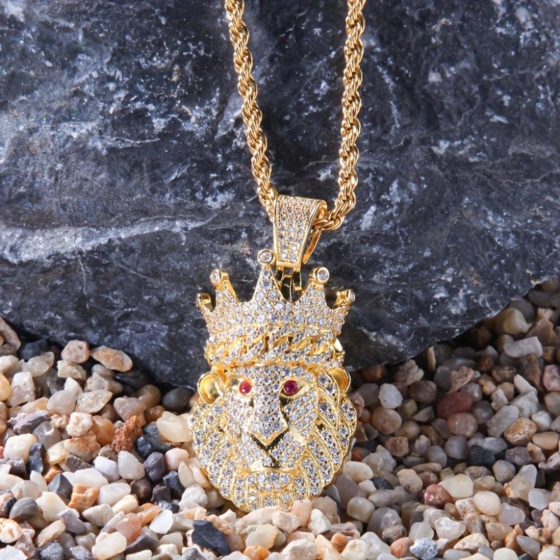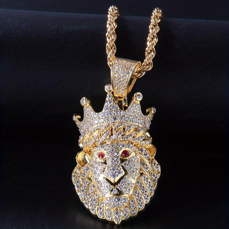This crown lion head pendant is a hip hop jewelry piece perfect for men. It features a stylish design that exudes a sense of power and dominance, making it a great gift option.
