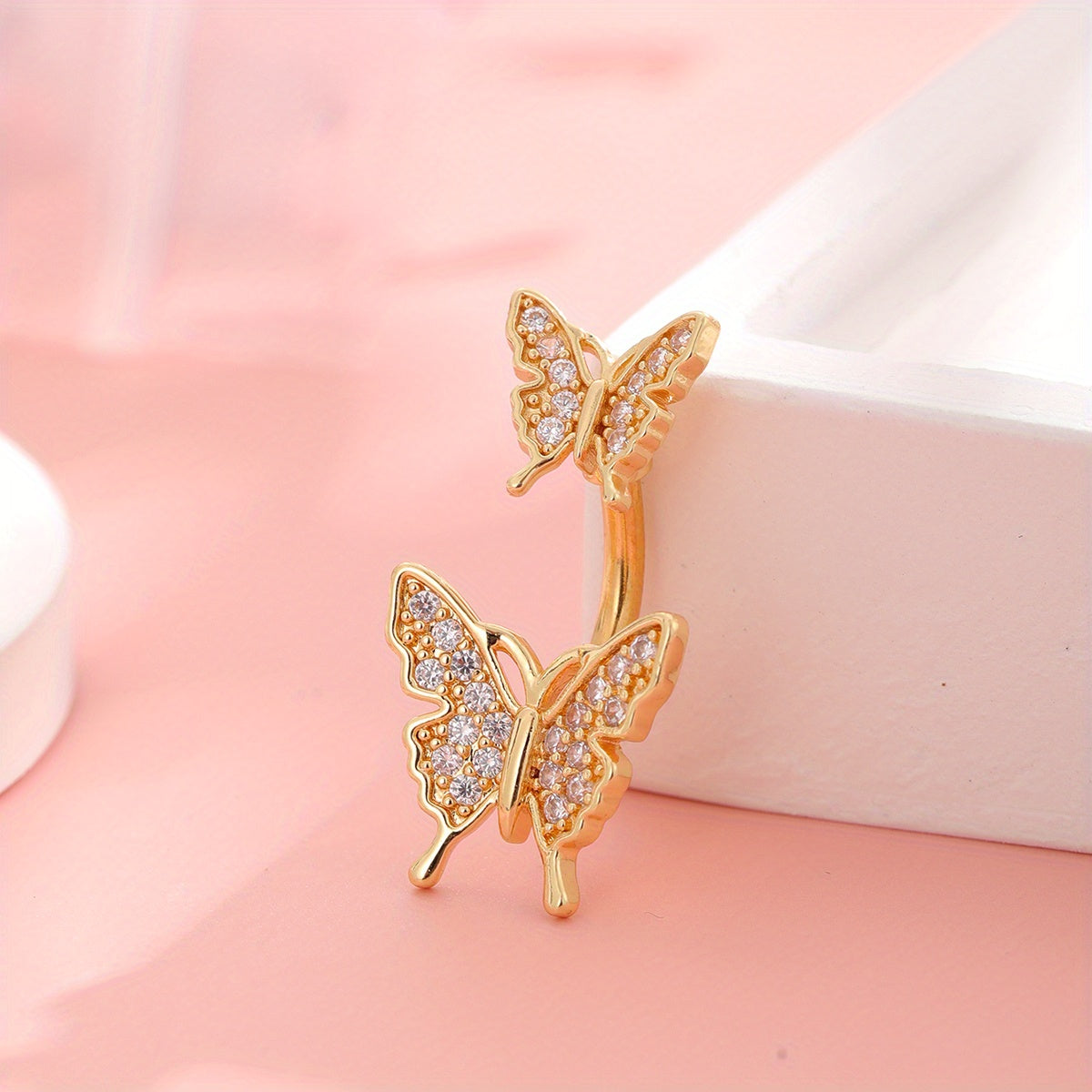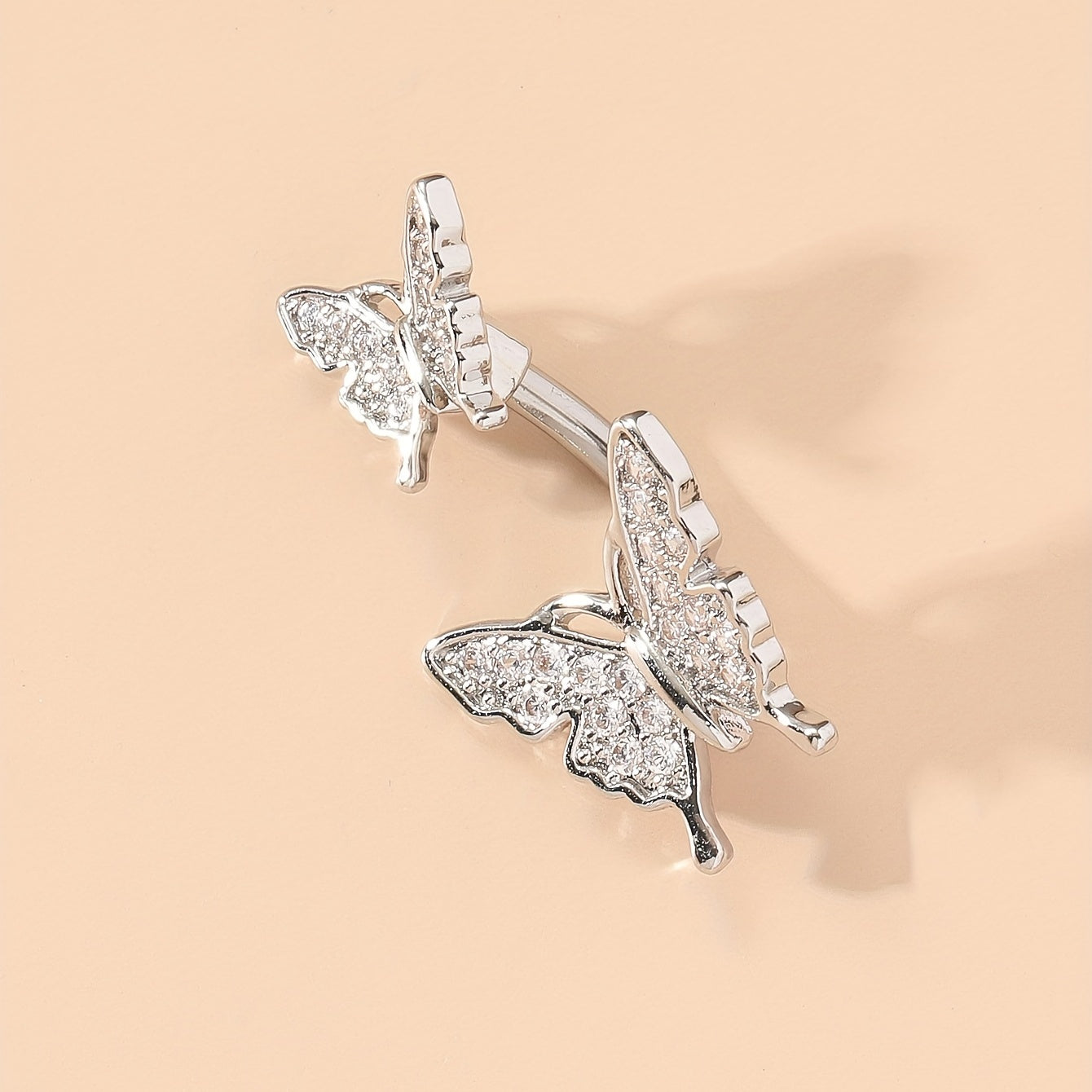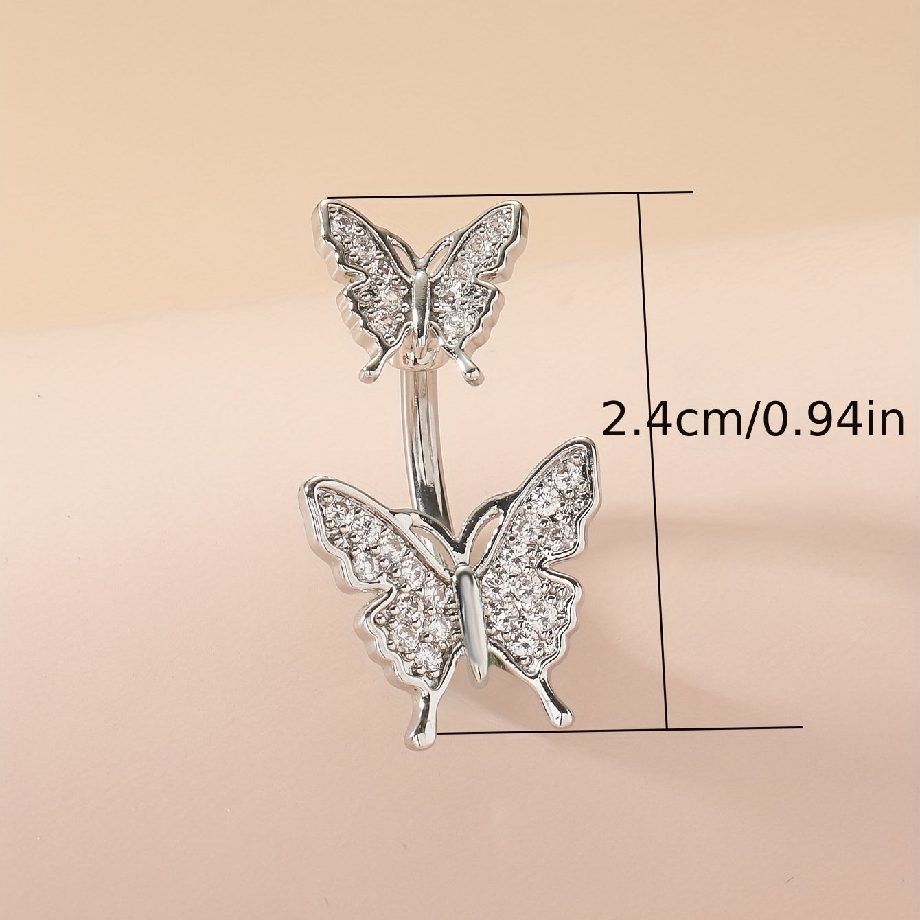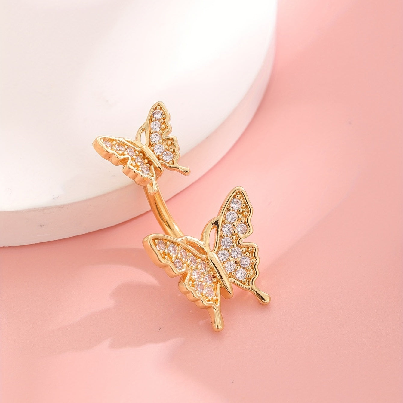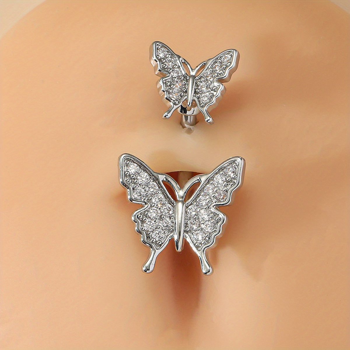 This stunning belly button ring features a double butterfly shape design with inlaid rhinestones. Crafted from copper, this belly jewelry is a beautiful addition to your collection.