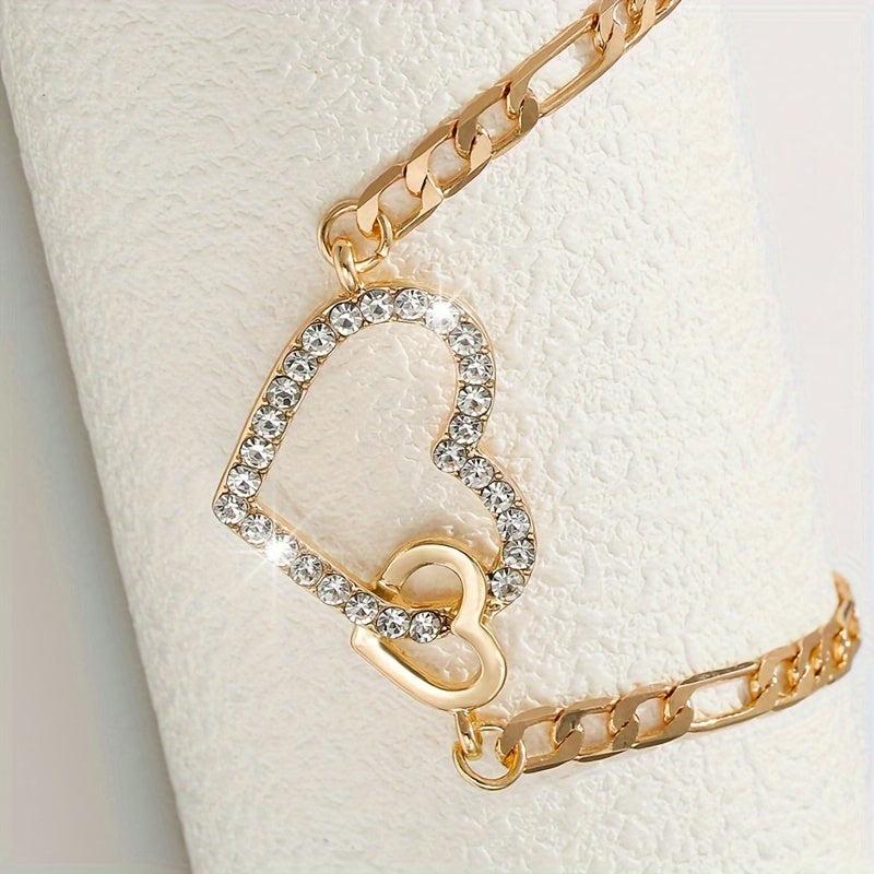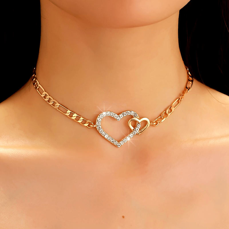 Add a touch of elegance with this sparkling double heart rhinestone choker necklace. The golden tone and intertwined hearts design make it a stylish accessory for any outfit.