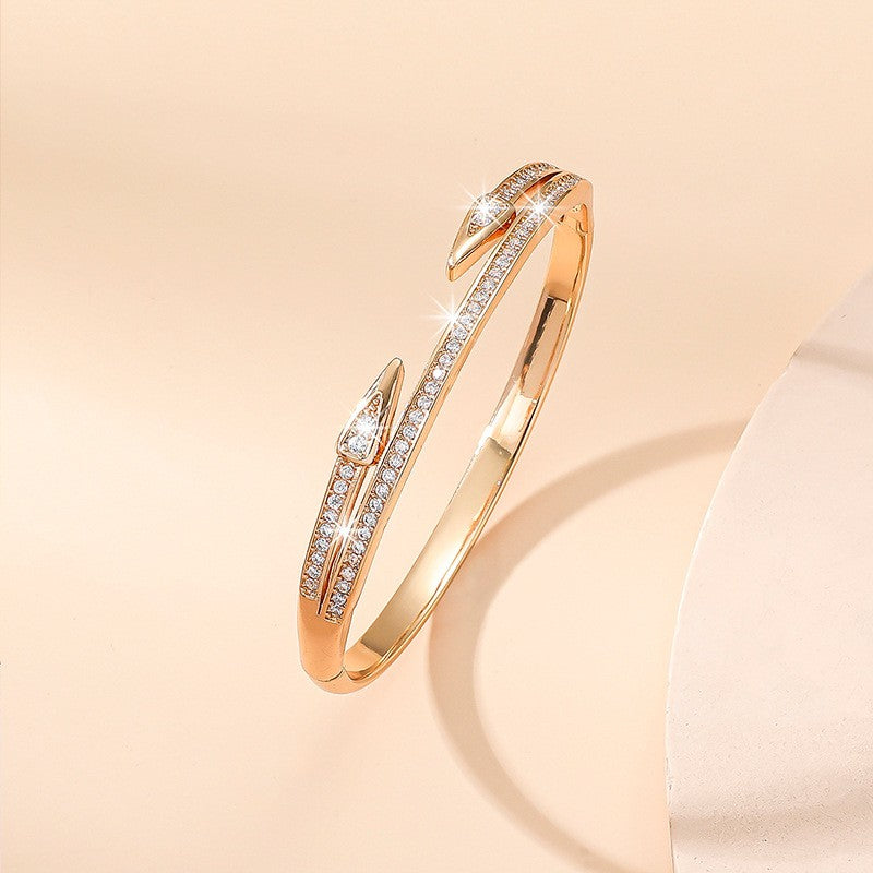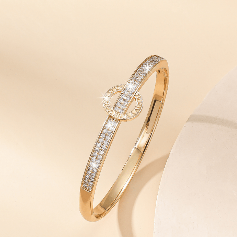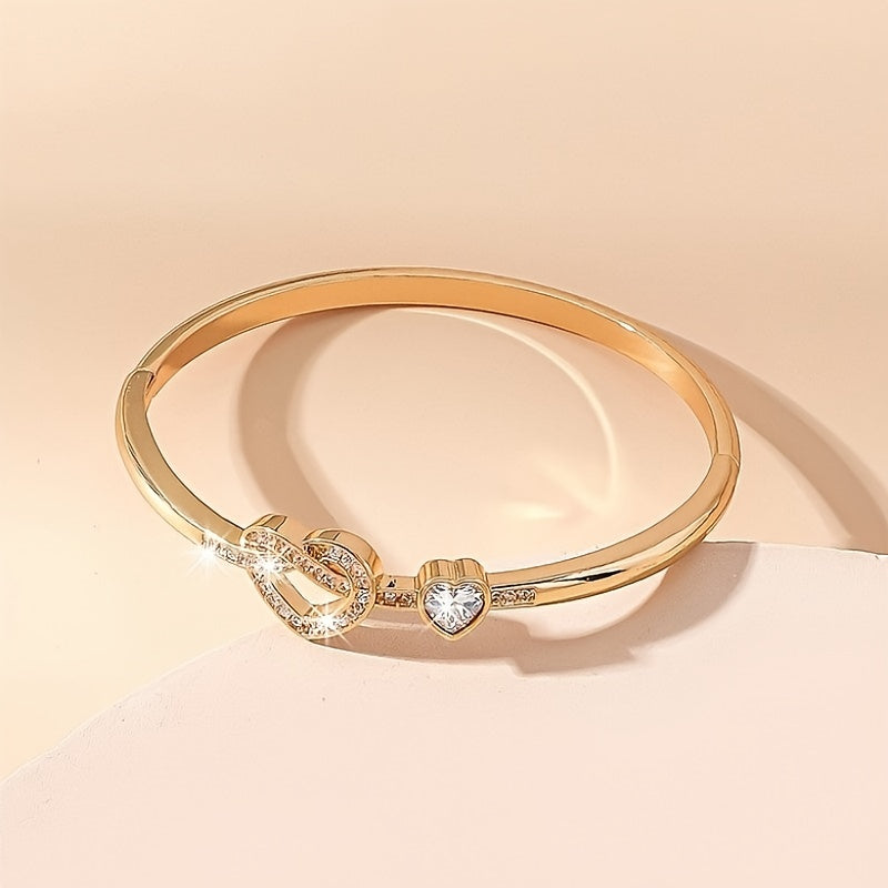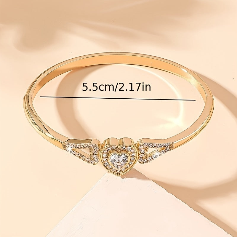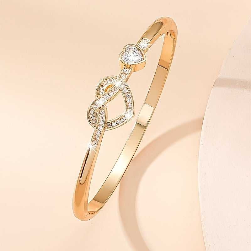 Elegant open cuff bracelet adorned with sparkly zircon, featuring double heart shape design. Crafted with copper and 18K gold plating for a luxurious look.