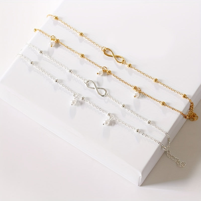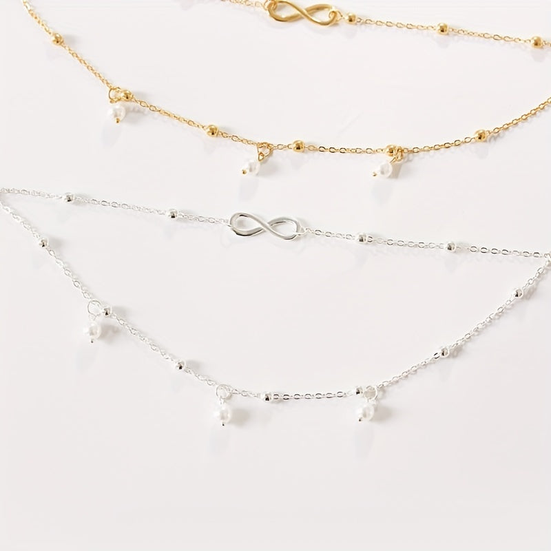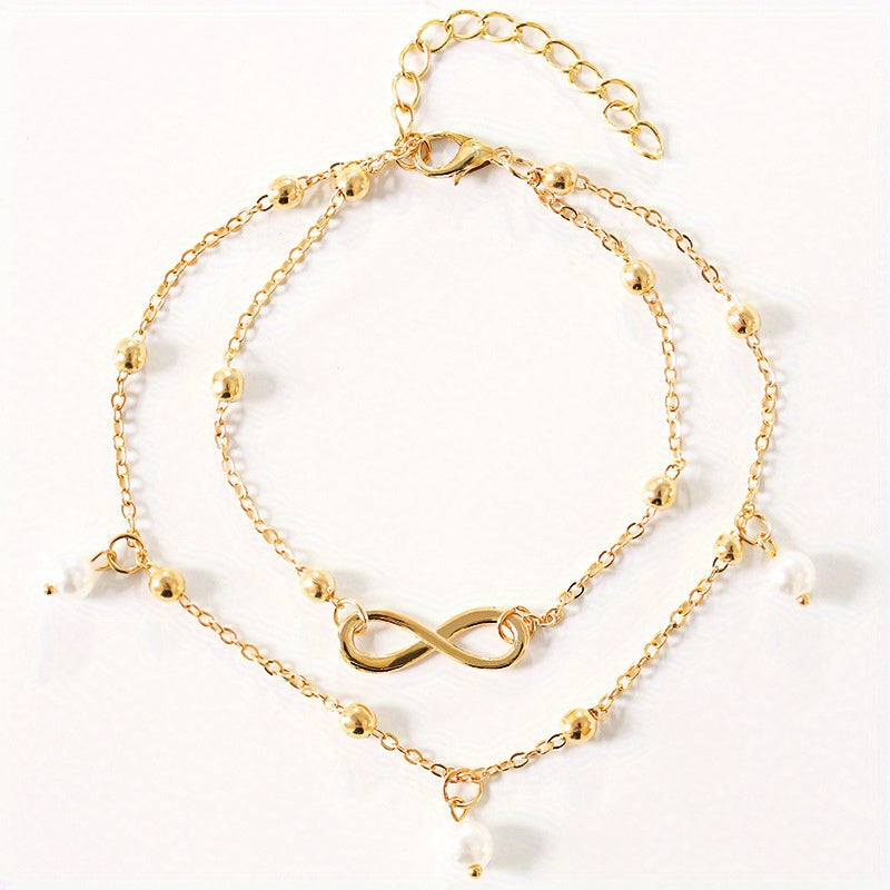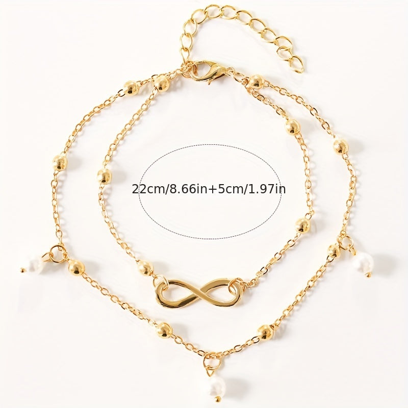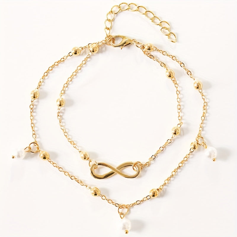 Elevate your style with this elegant double layer chain anklet featuring faux pearls pendant and infinity symbol beads. Perfect accessory for a chic look.
