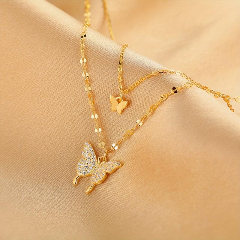 Double Layered Butterfly Pendant Necklace with Gemstones for Women