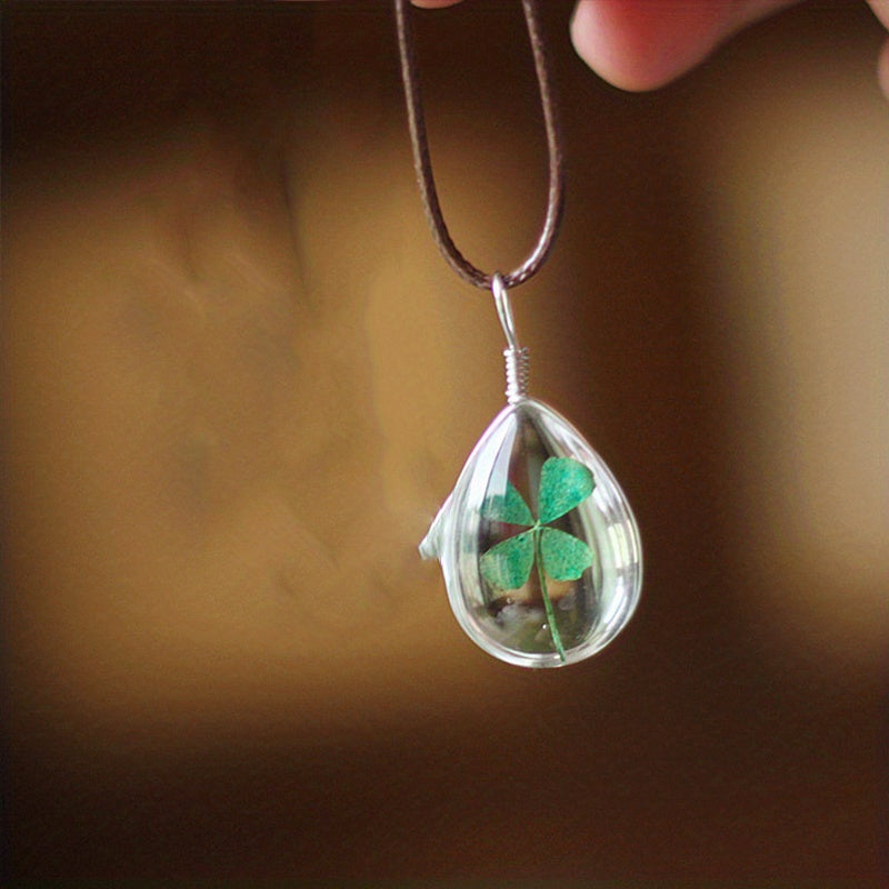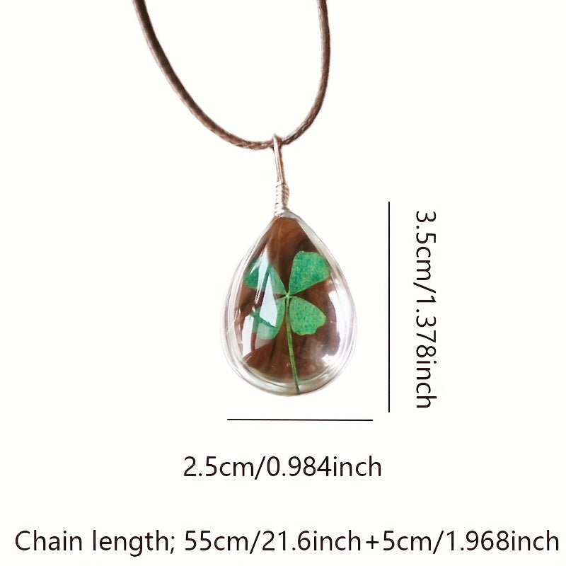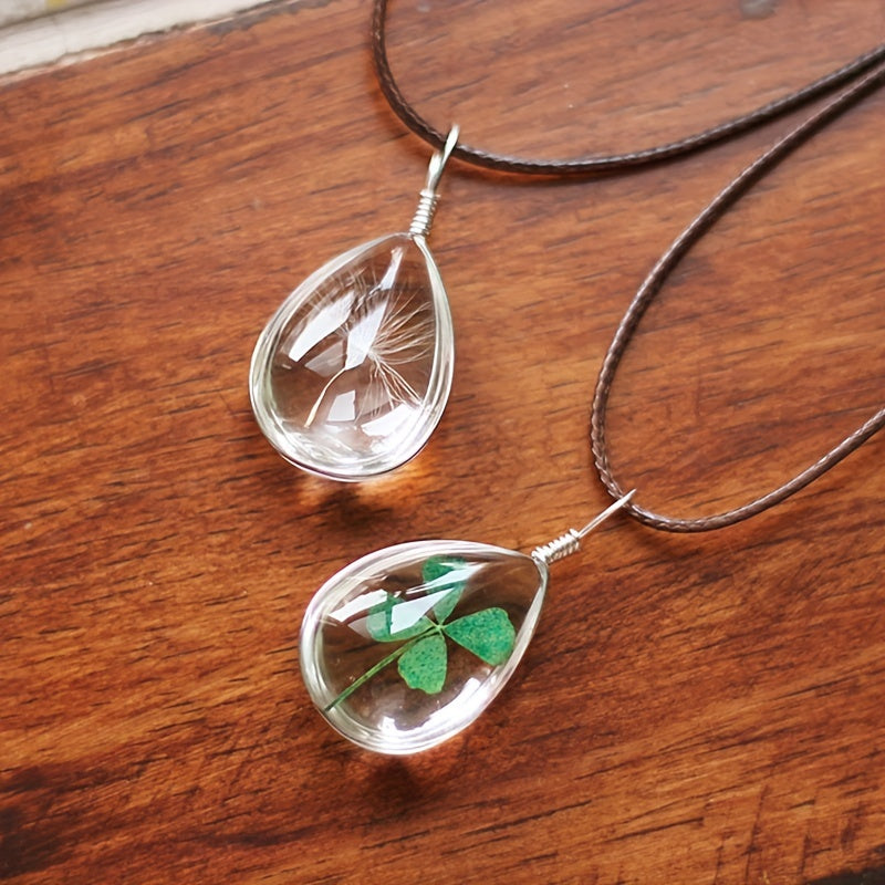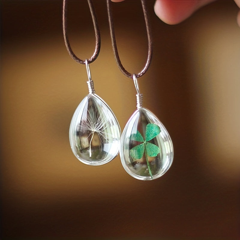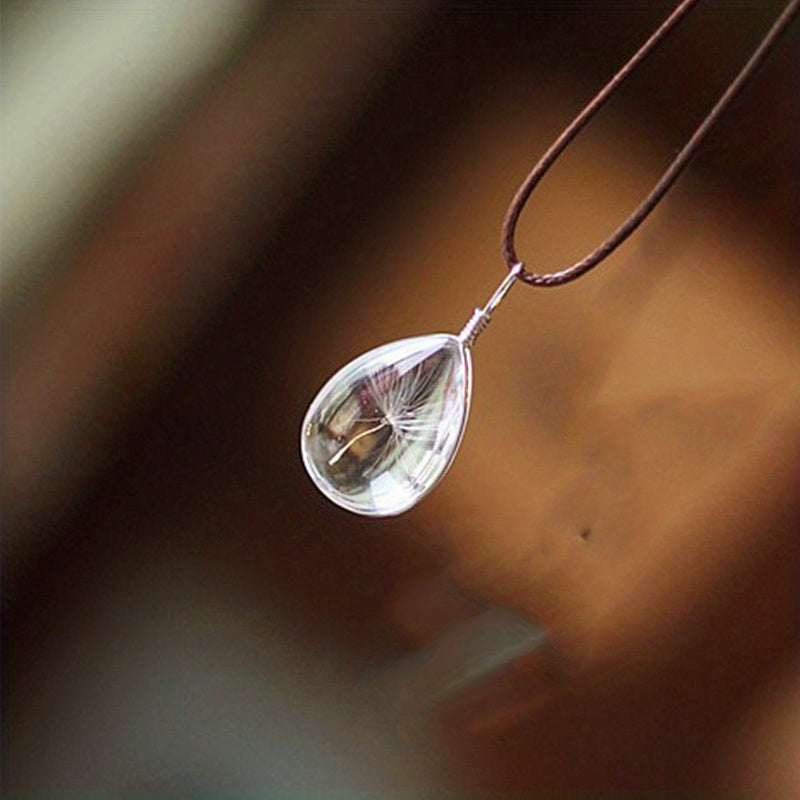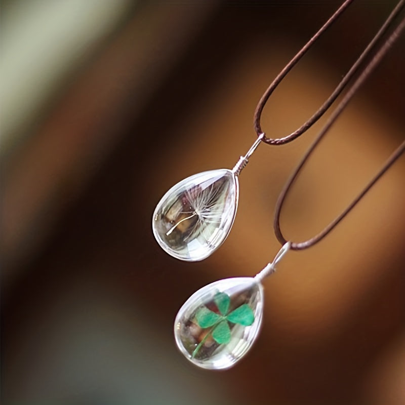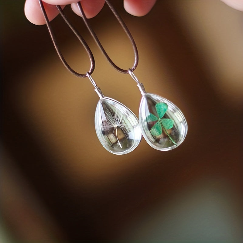 This unique necklace features a real dried dandelion clover encased in resin on a leather chain. Perfect for nature lovers and boho style enthusiasts.