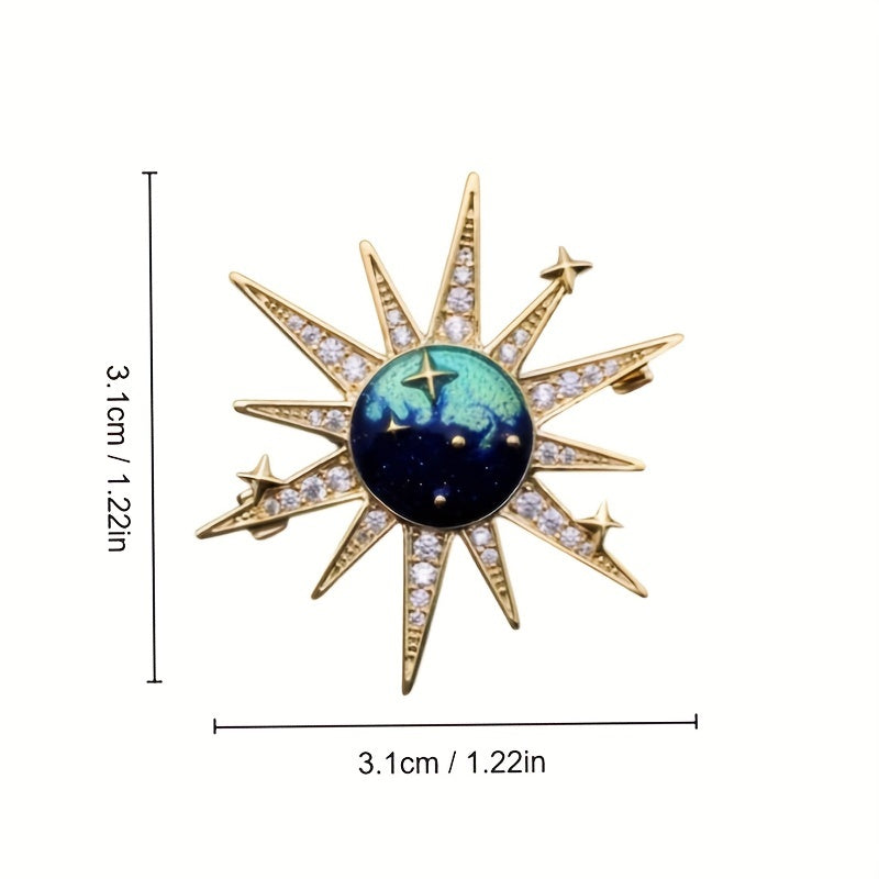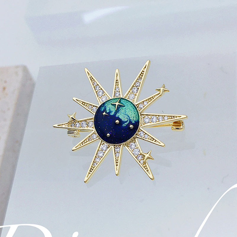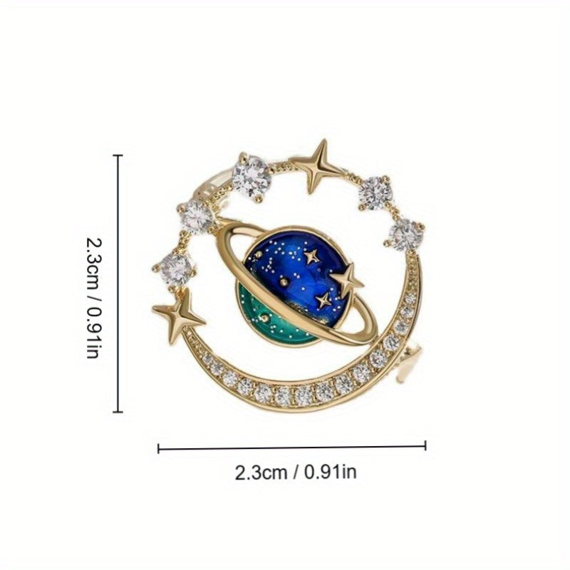 Add a touch of celestial charm to your outfit with this Earth Moon Star Brooch Pin. Inlaid with sparkling rhinestones, this accessory is perfect for coats and clothing. Elevate your style with this jewelry accessory.