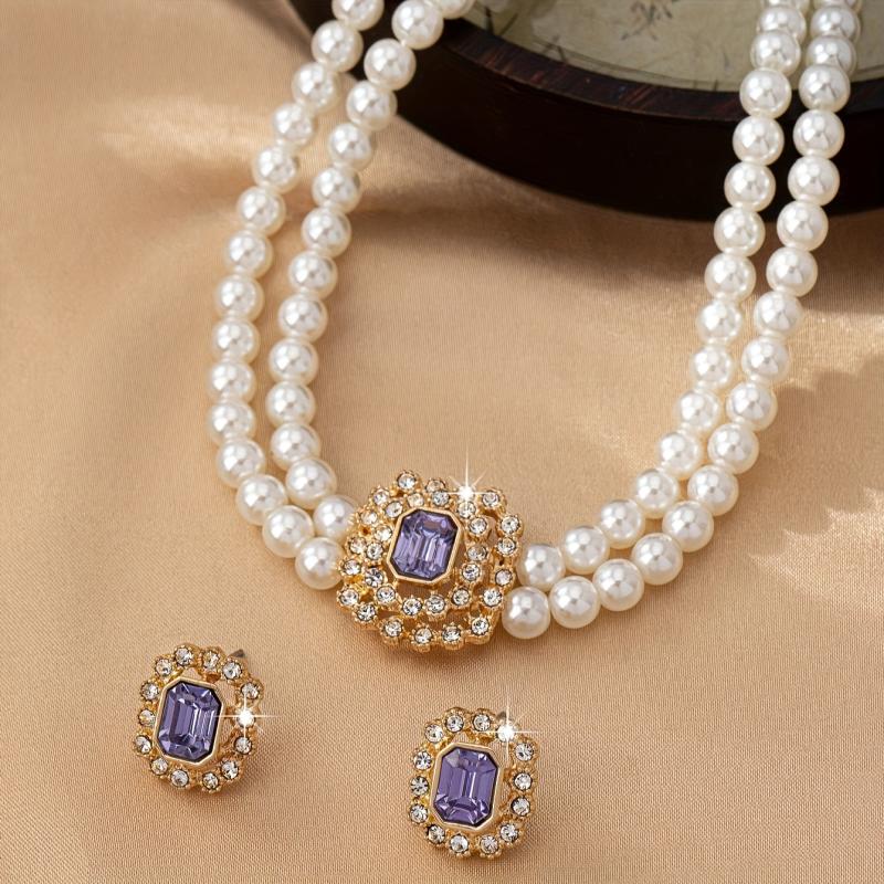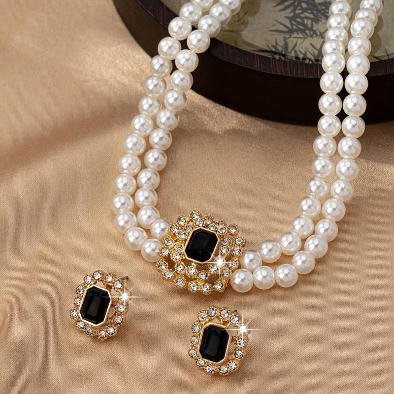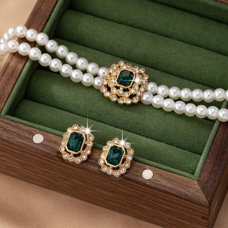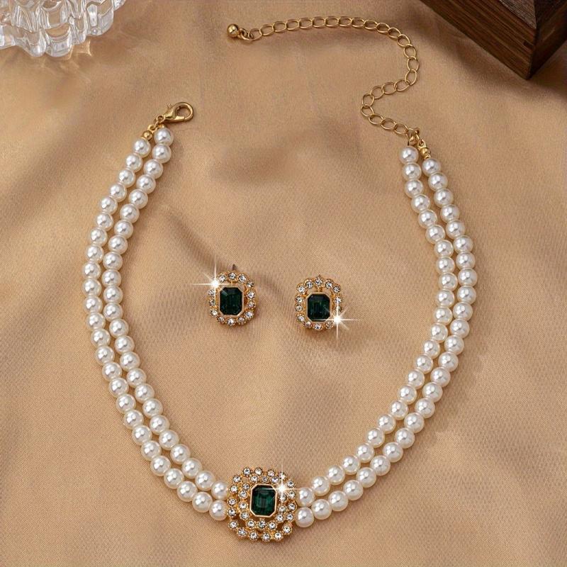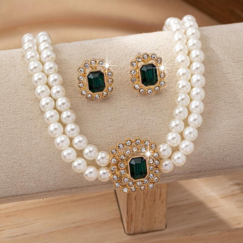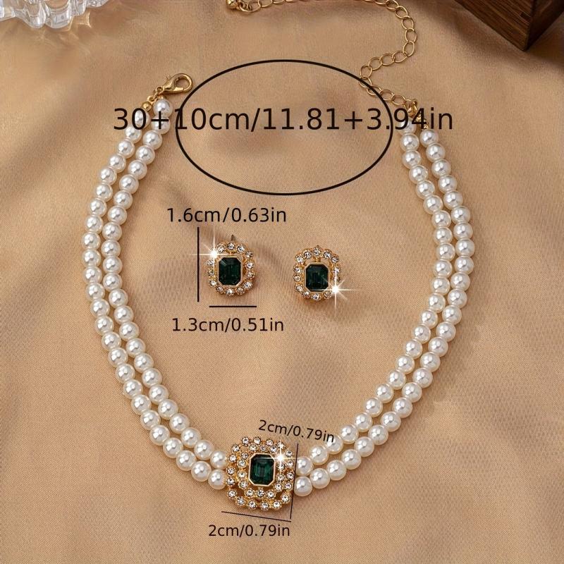 Complete your look with this stylish faux pearl jewelry set featuring rhinestone accents and green acrylic gems. Perfect for daily wear or special occasions.
