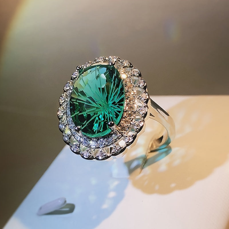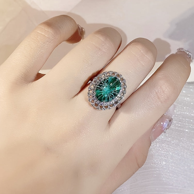 This oval emerald zircon eternity ring is a stunning and delicate piece of jewelry, perfect for weddings, engagements, and parties. It is designed for women and girls who appreciate elegance and style.