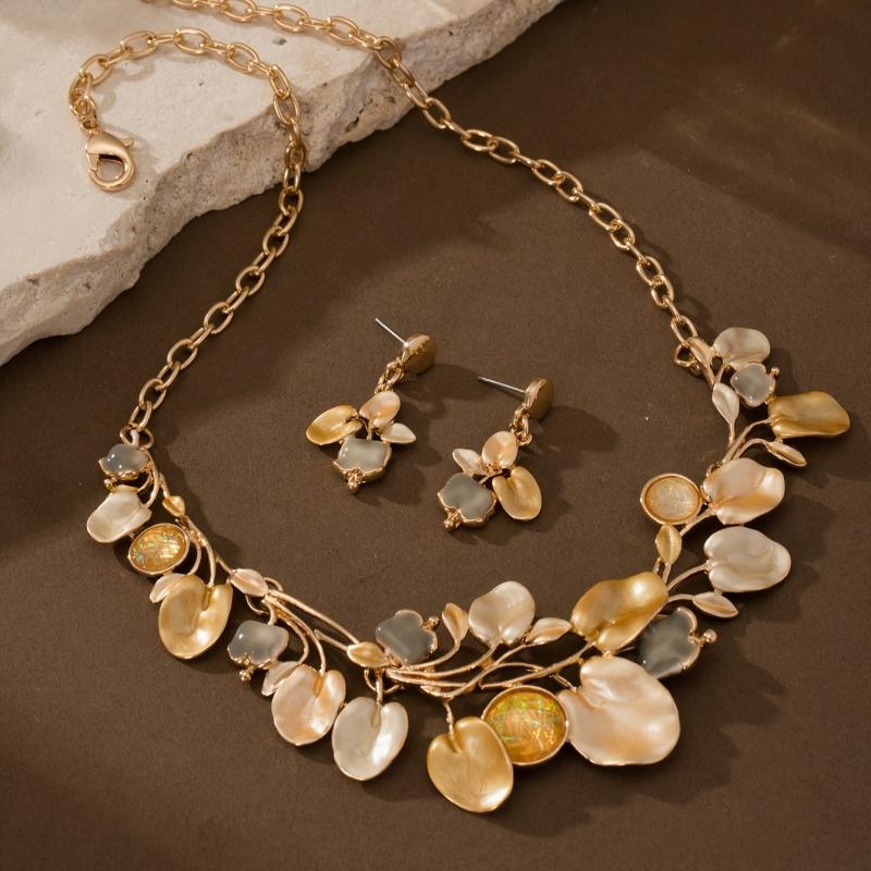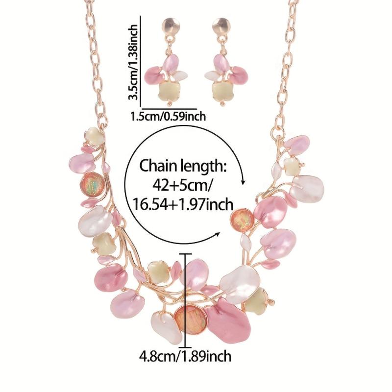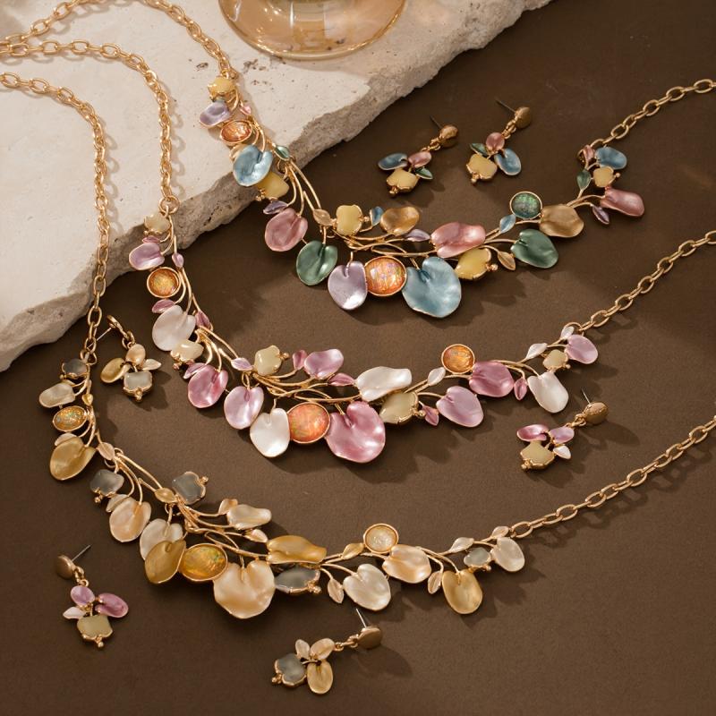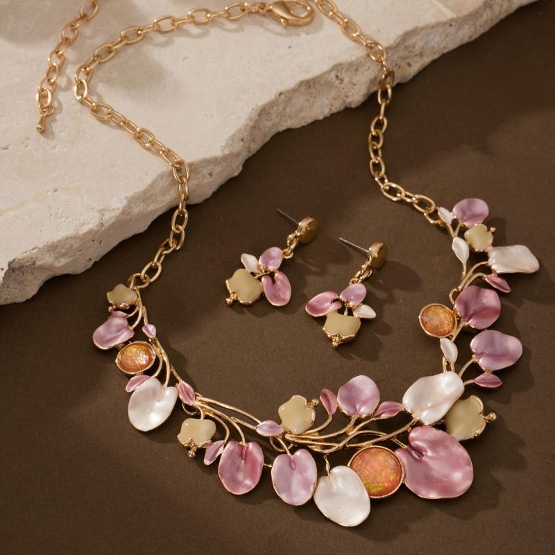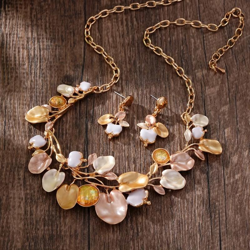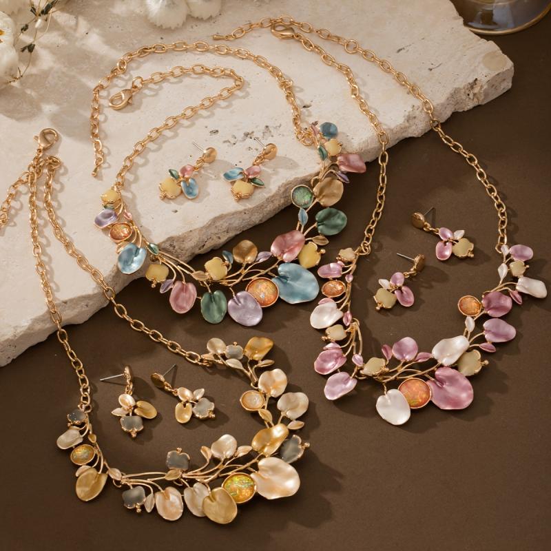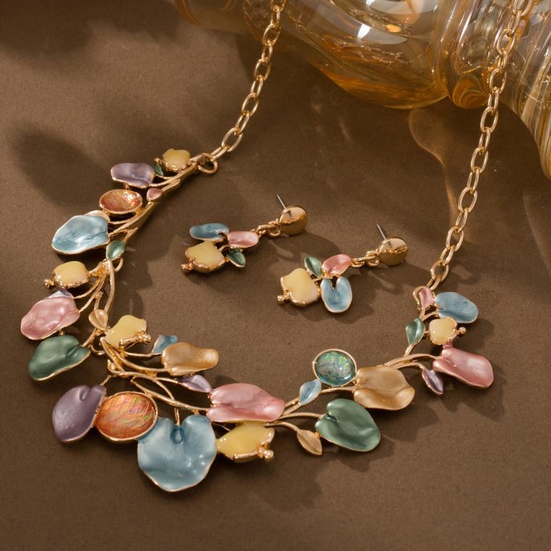 This vintage zinc alloy jewelry set includes a pair of earrings and a necklace, perfect for summer. It features colorful enamel flower design, ideal for women of all ages. Give it as a thoughtful Mother's Day or family gift.