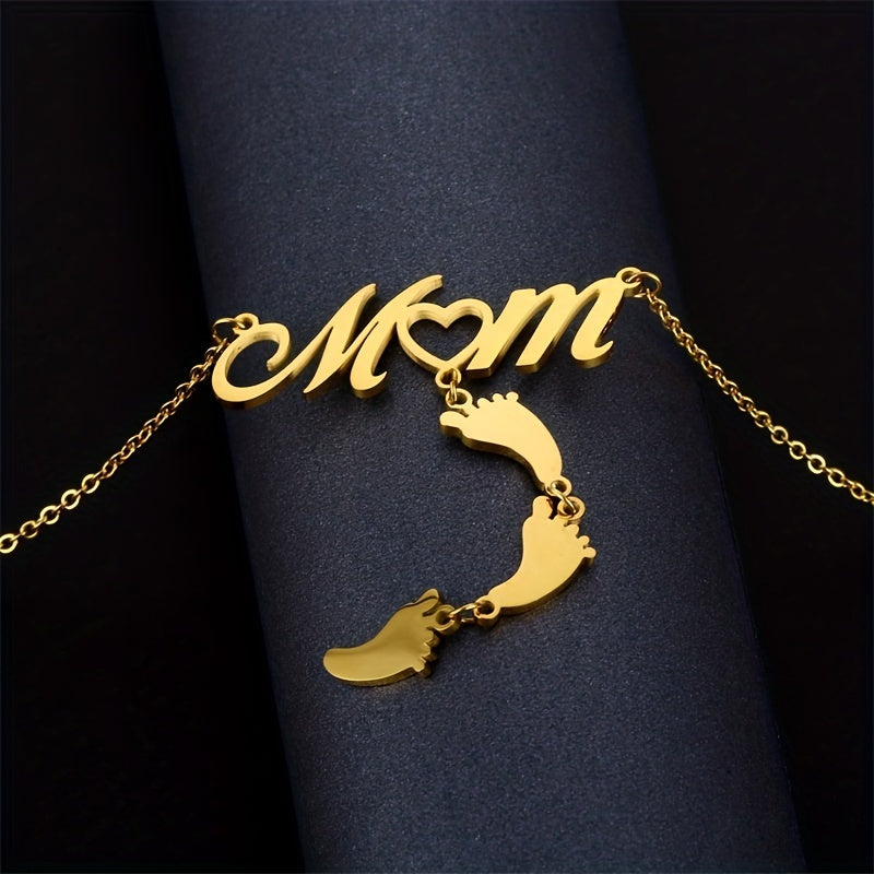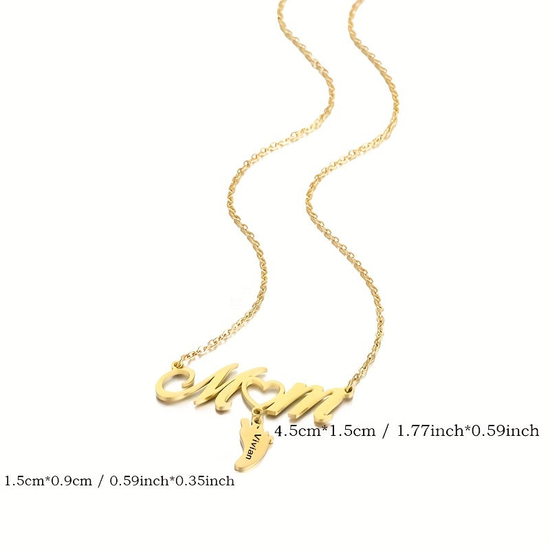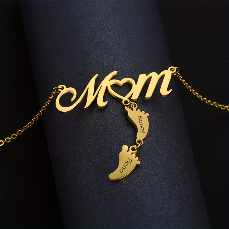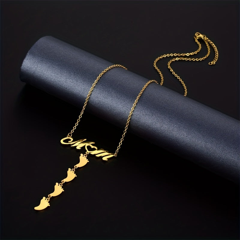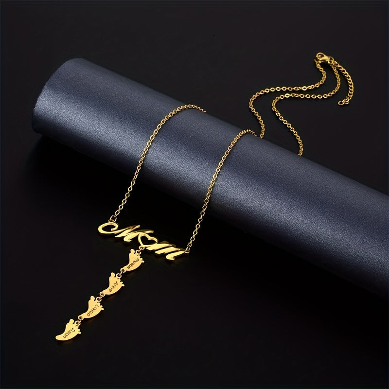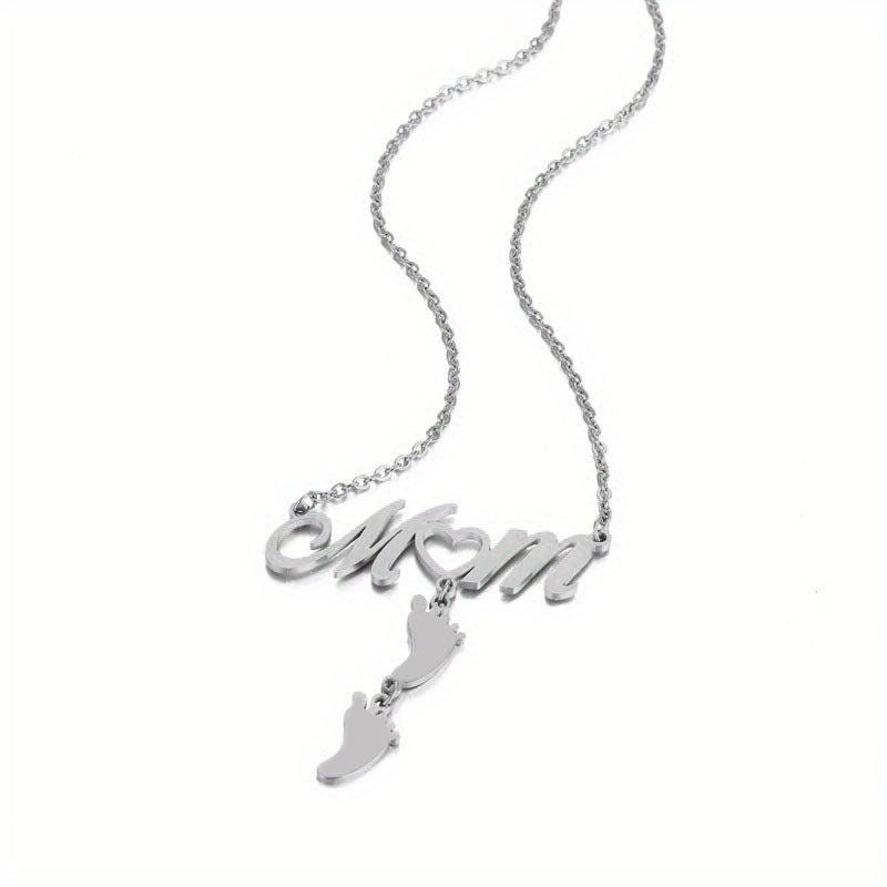 This personalized necklace features a nameplate pendant with engraved kids foot design, perfect for mom or girlfriend. Made of stainless steel, it's a meaningful gift for Mother's Day or any occasion.