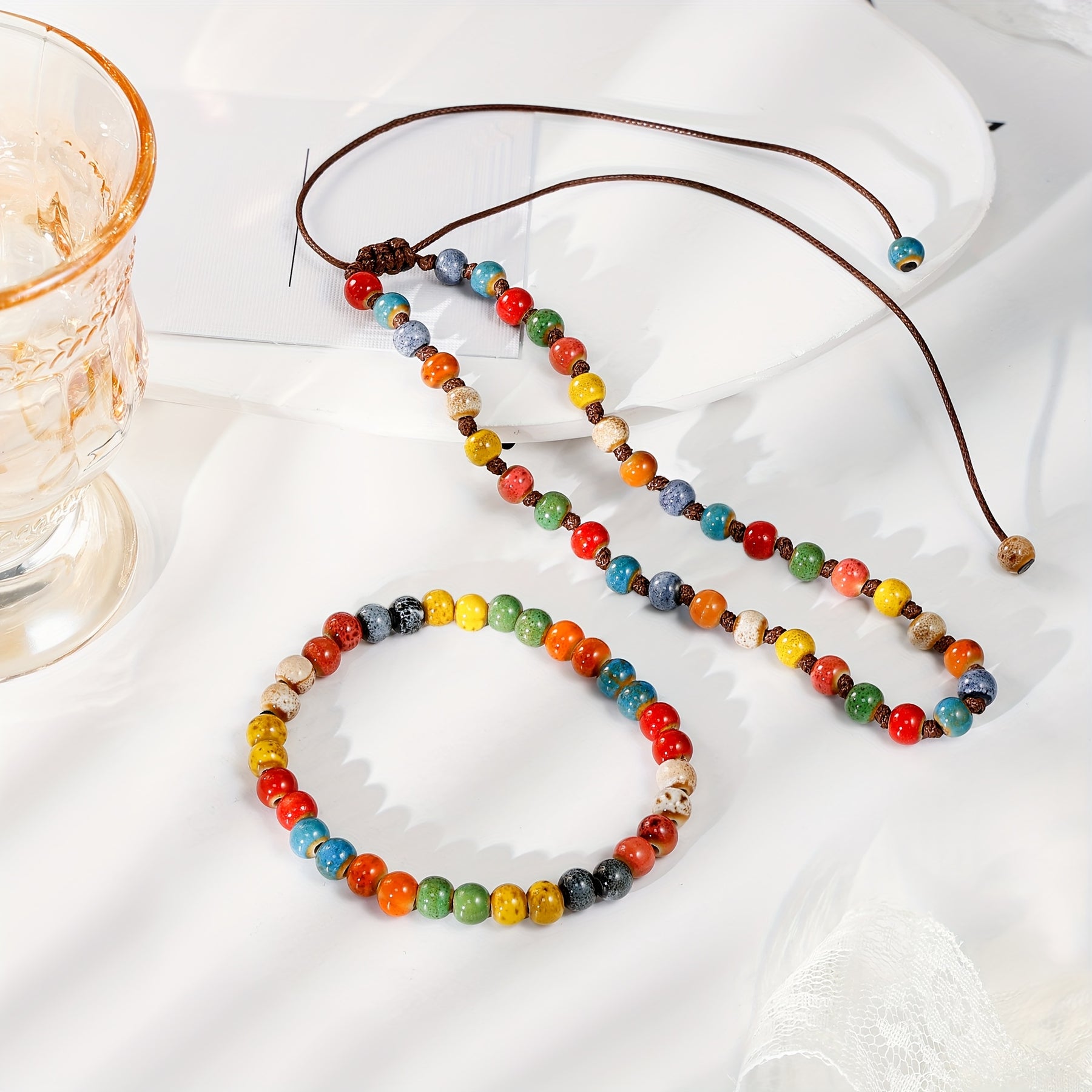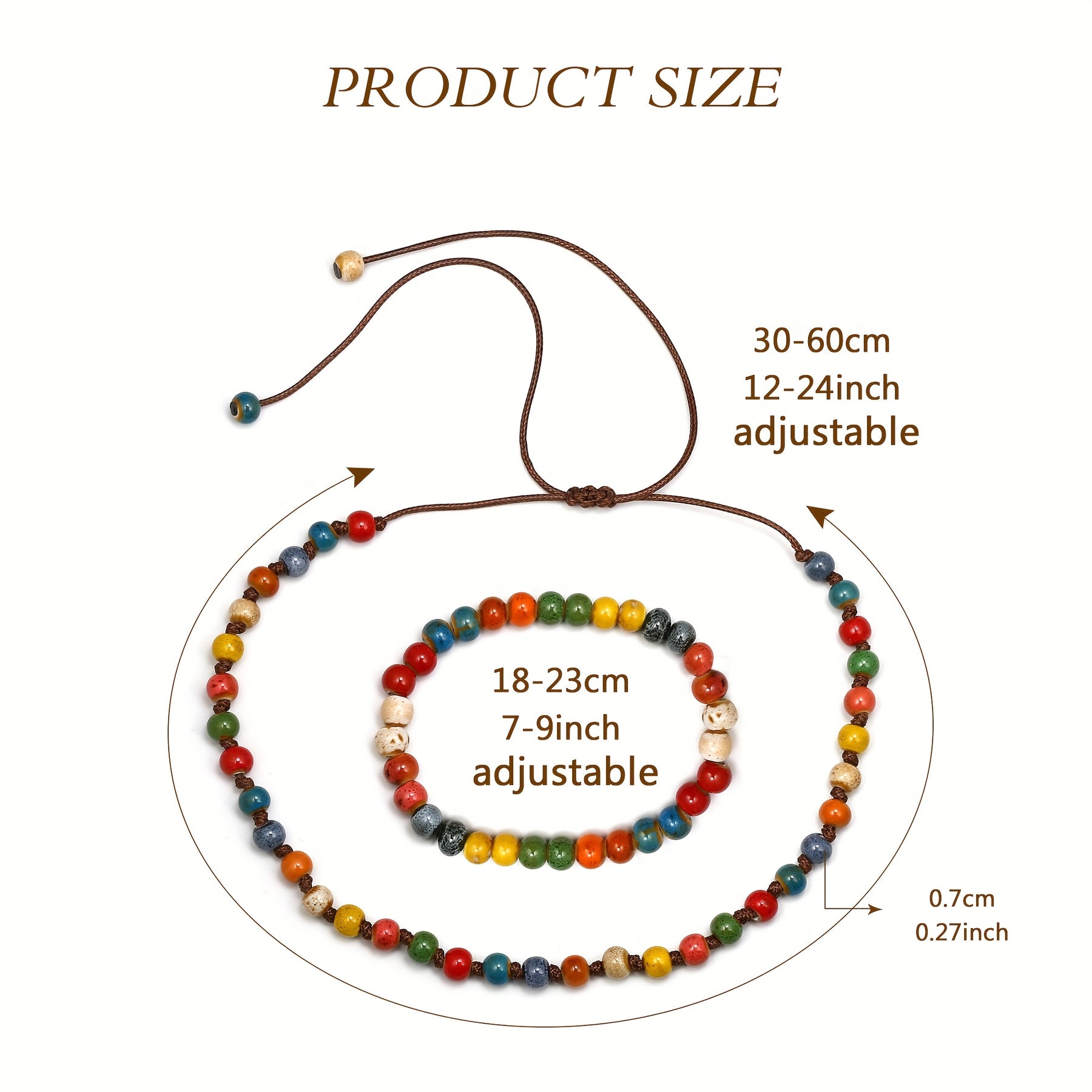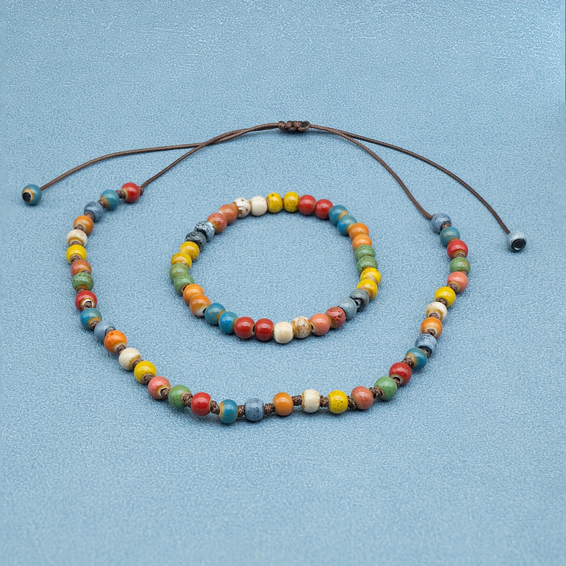 Boho holiday gift for men and women. Perfect for casual attire or vacation. Vintage ceramic bead jewelry set that includes an adjustable necklace and bracelet.