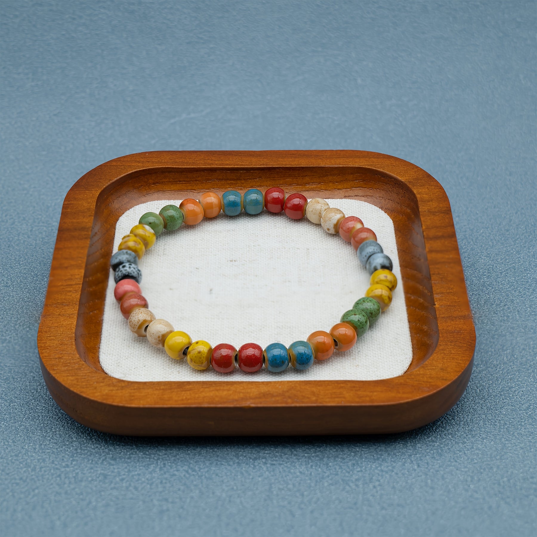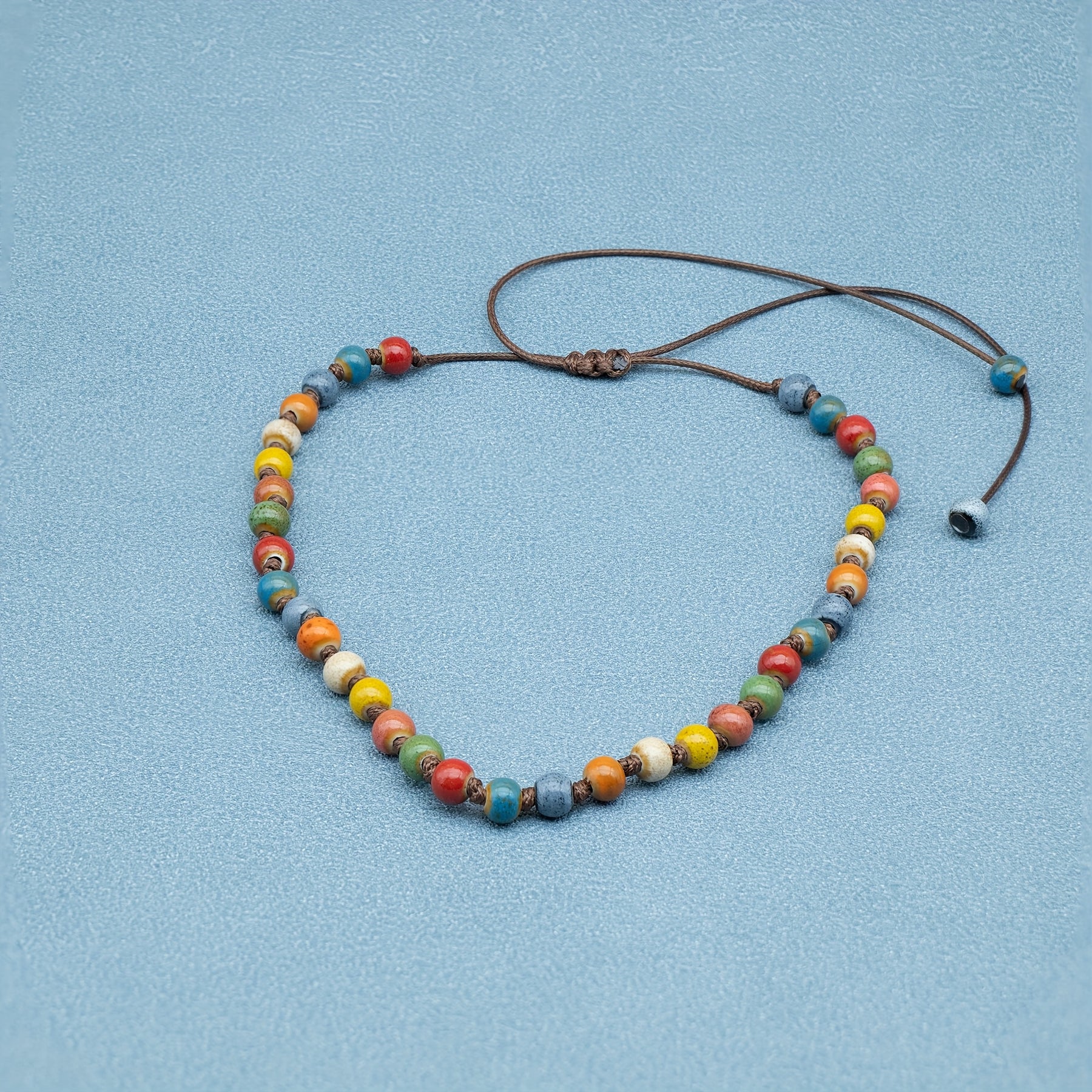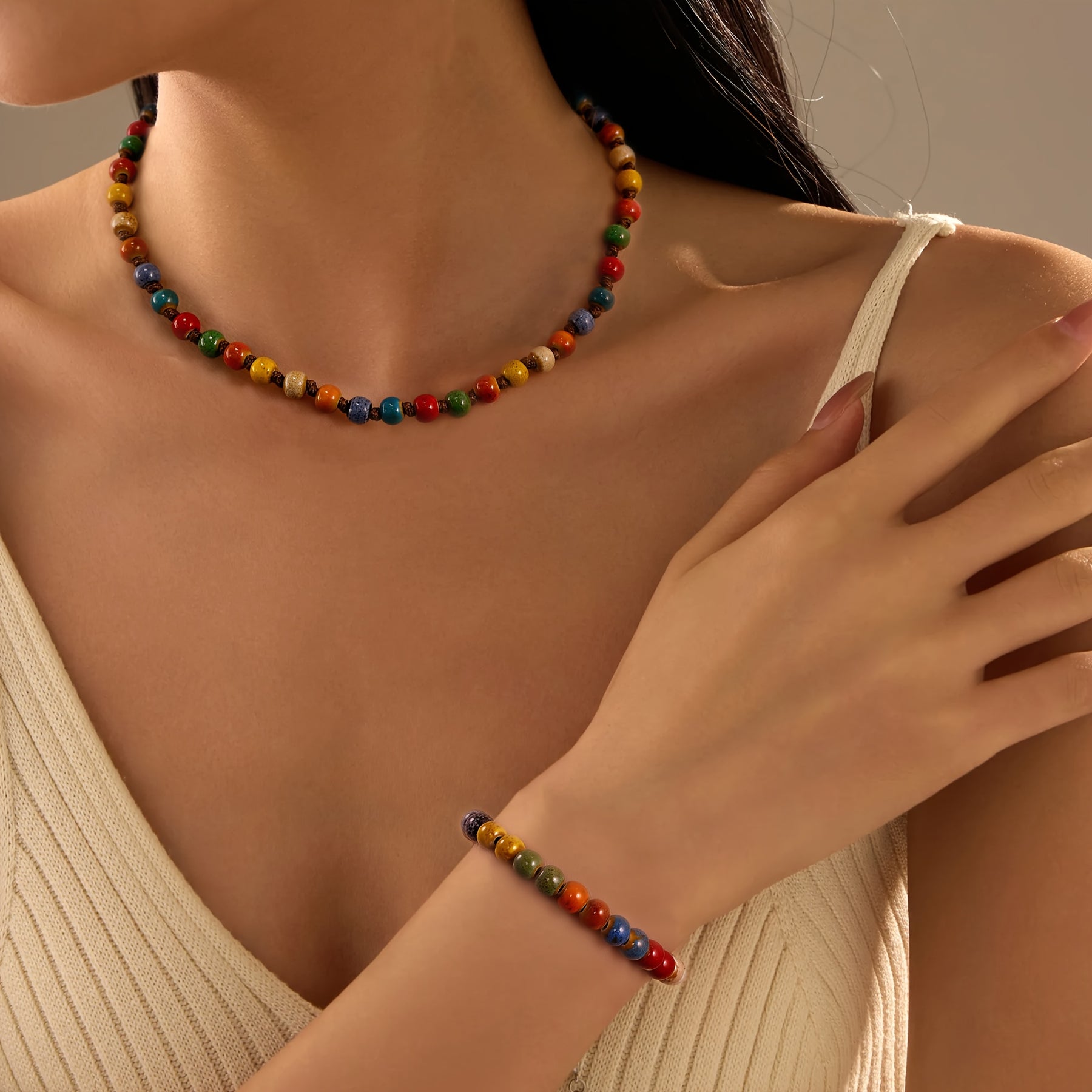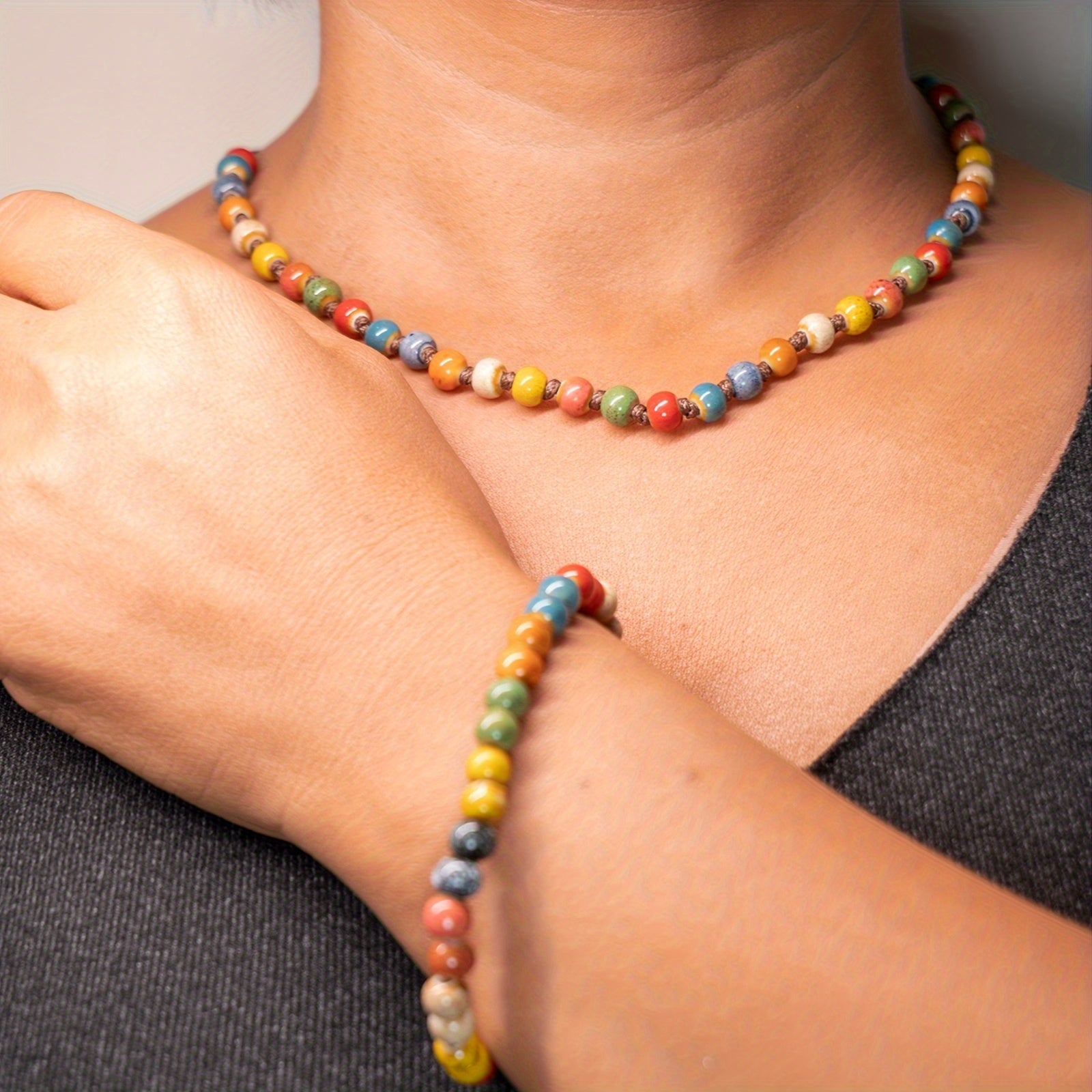 Boho holiday gift for men and women. Perfect for casual attire or vacation. Vintage ceramic bead jewelry set that includes an adjustable necklace and bracelet.