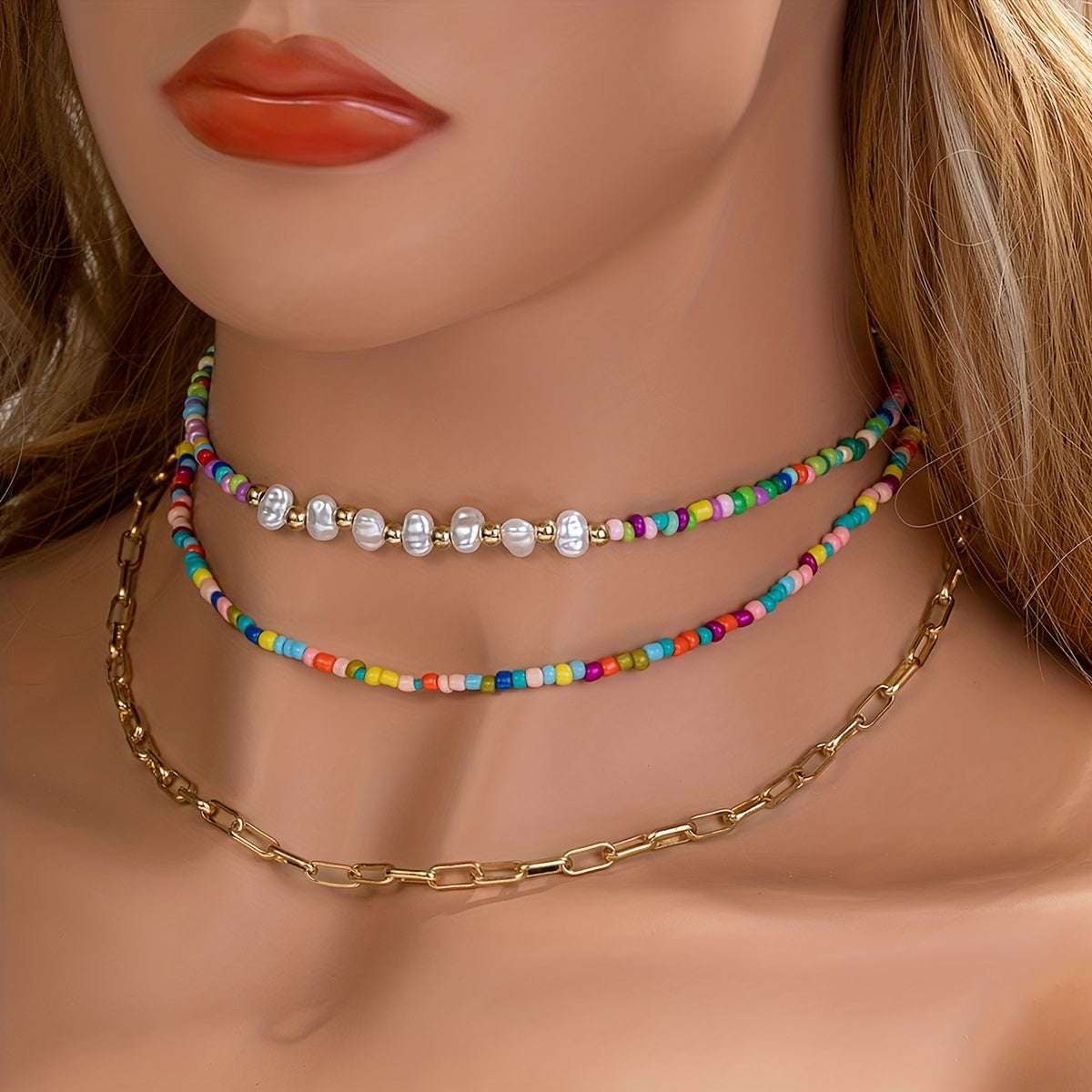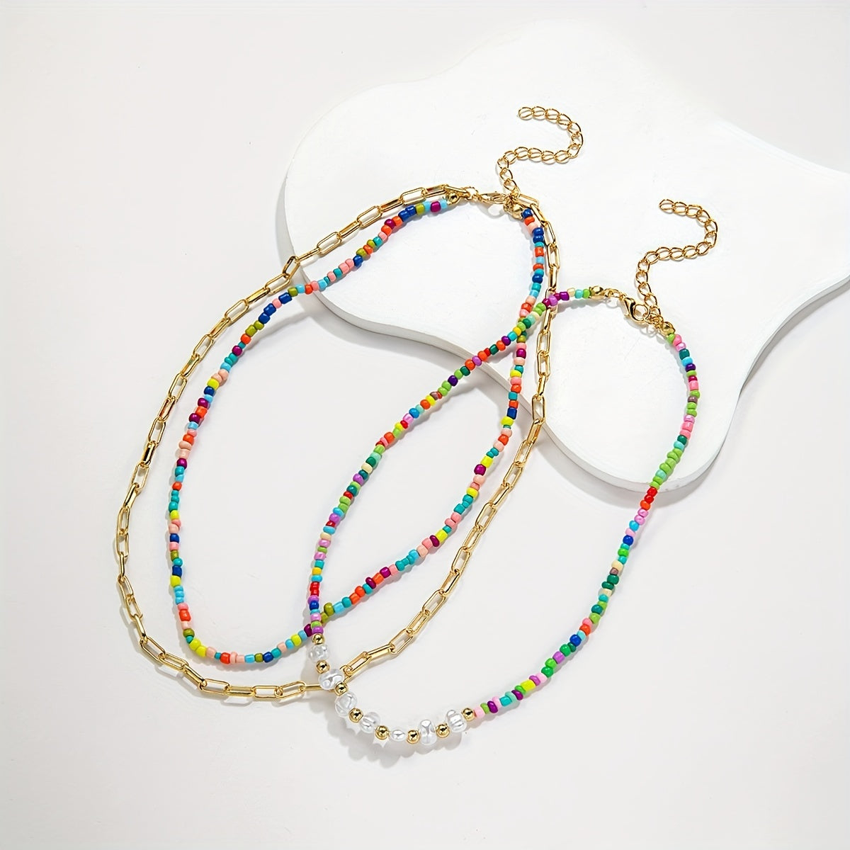 Enhance your style with this retro ethnic style necklace set featuring colorful beads and metal chains. Perfect for a bohemian look.