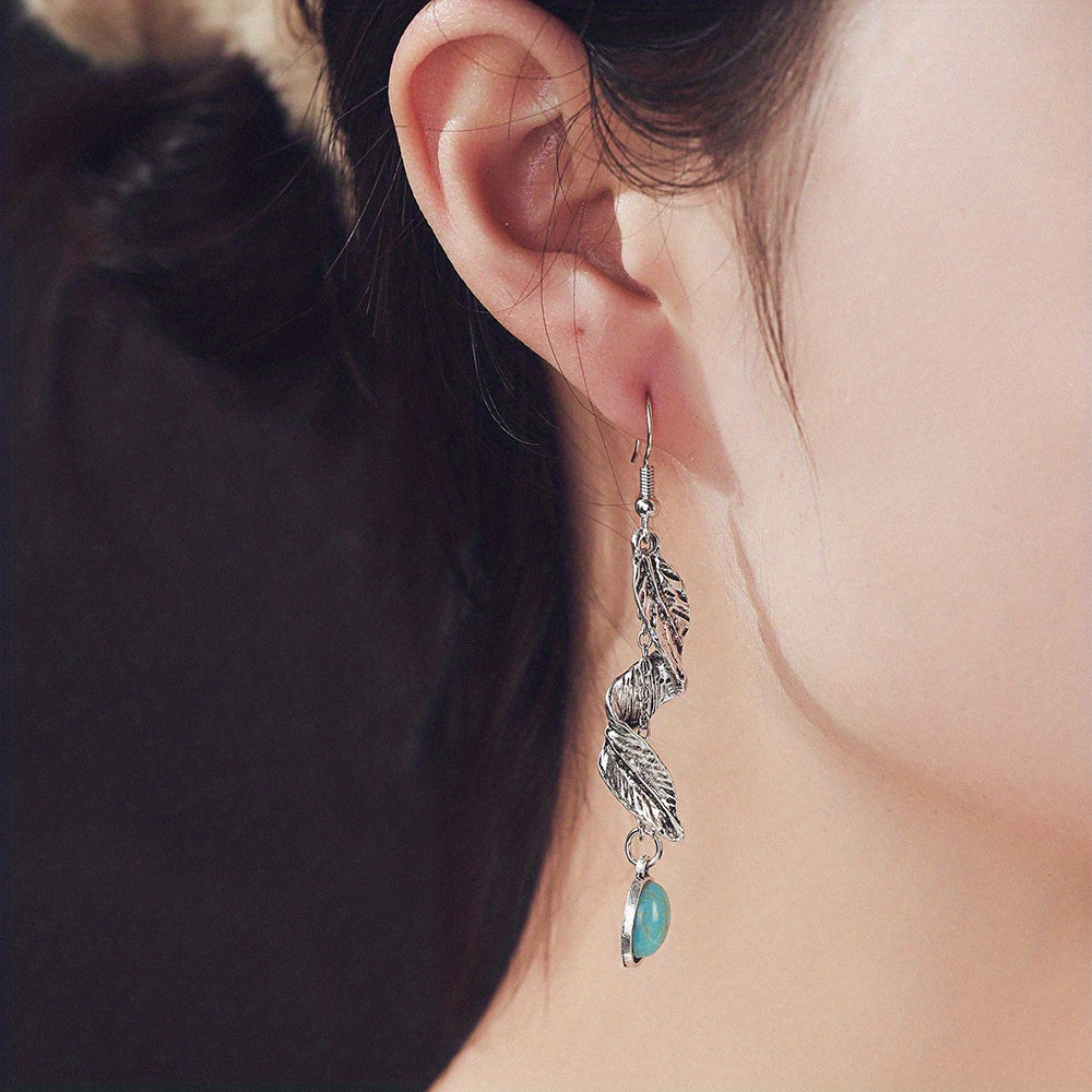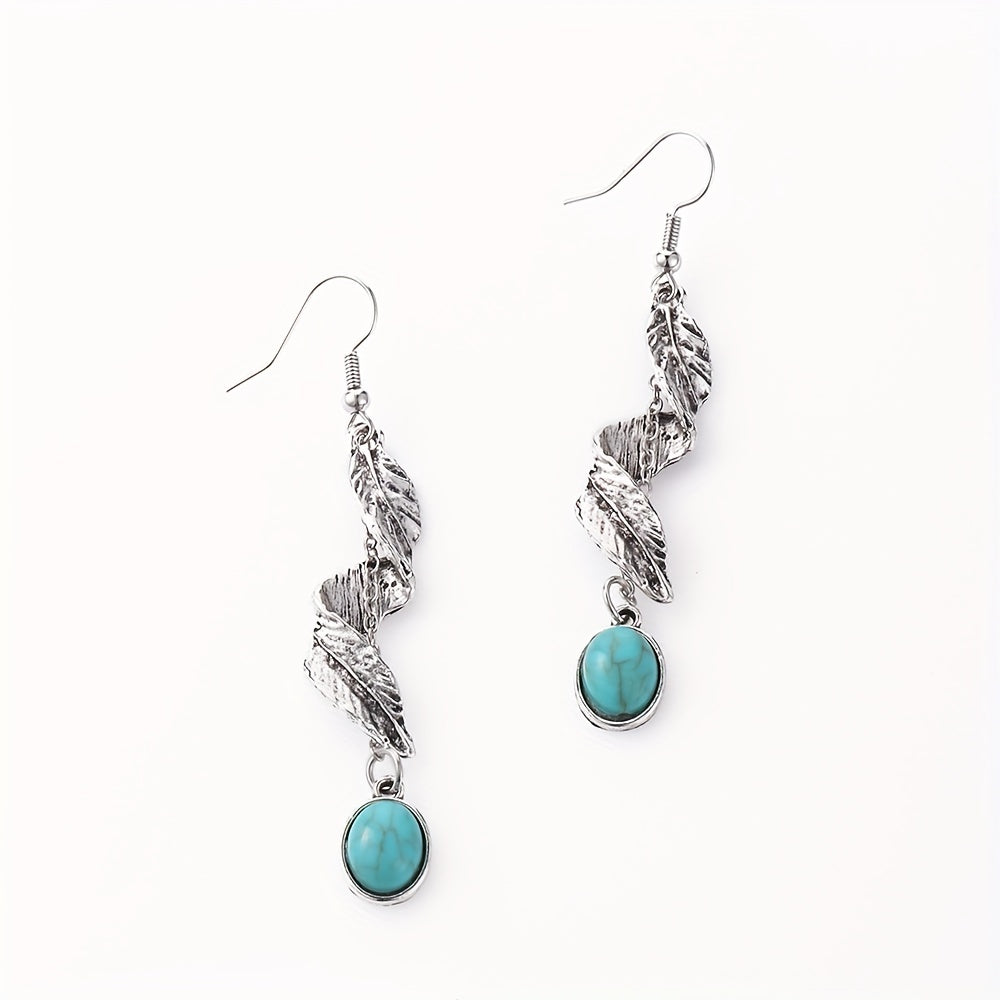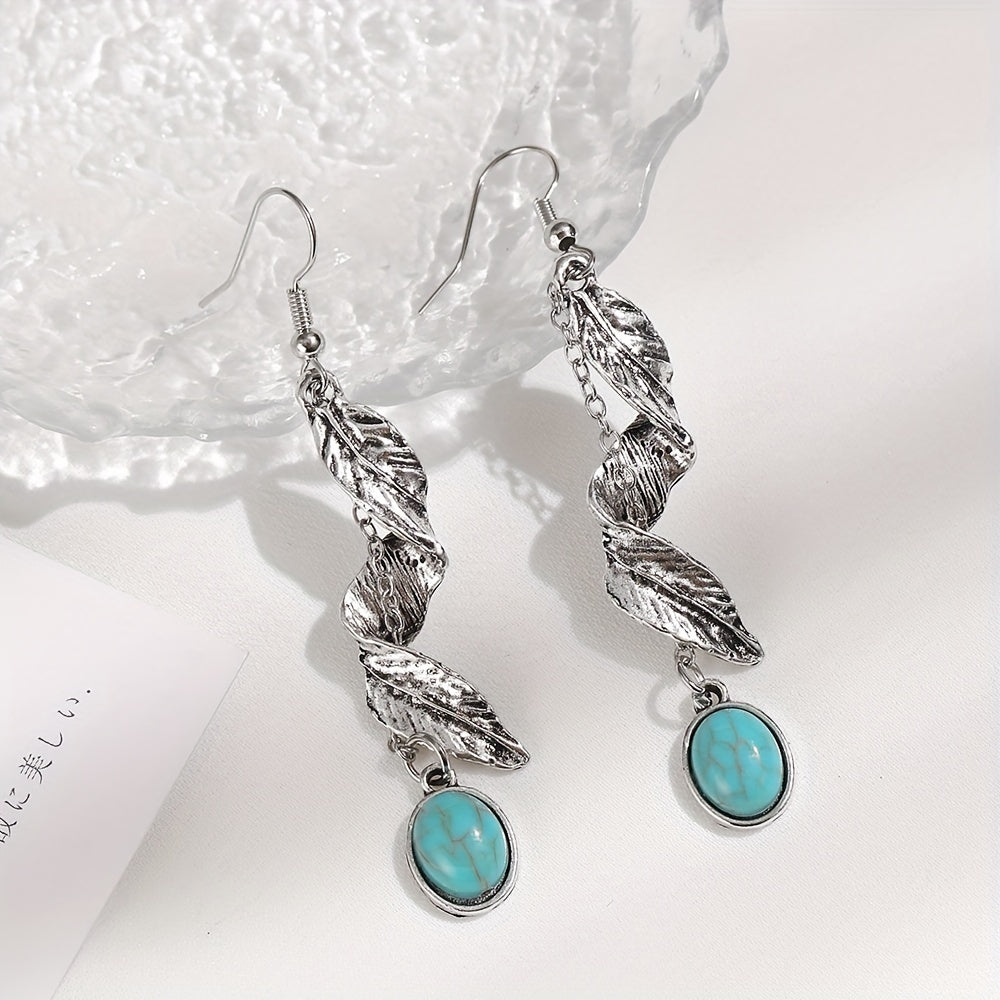These stylish dangle earrings feature spiral silvery leaf design with oval turquoise decor, making them a perfect gift for any female jewelry lover.
