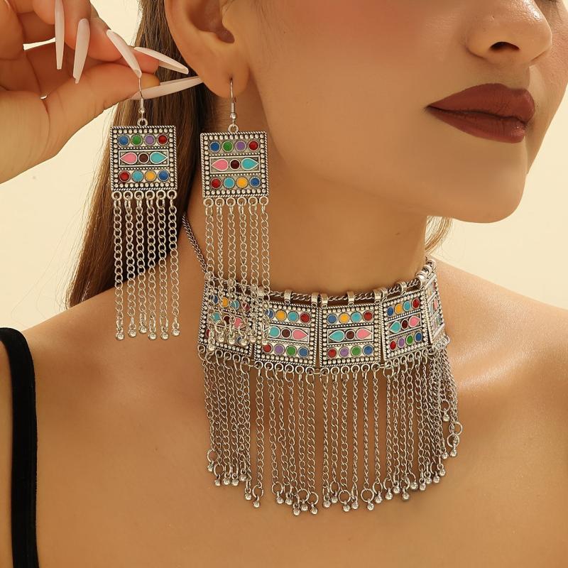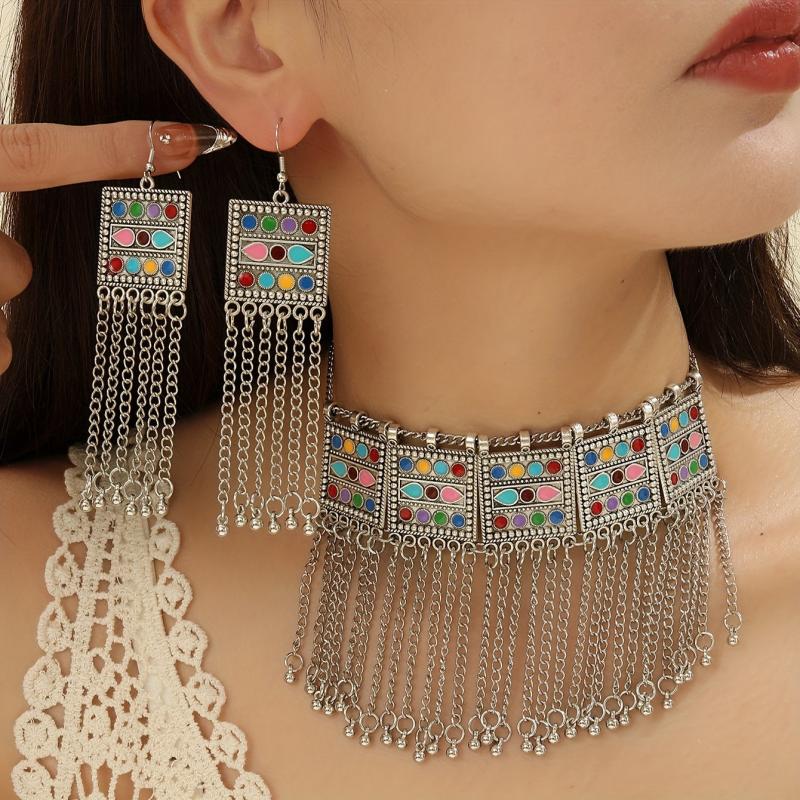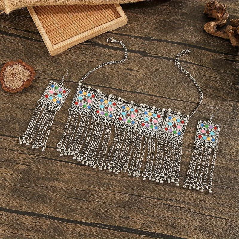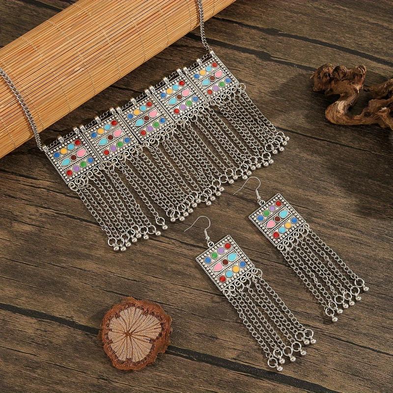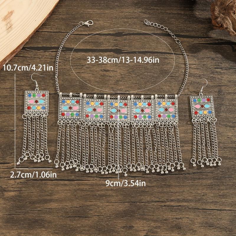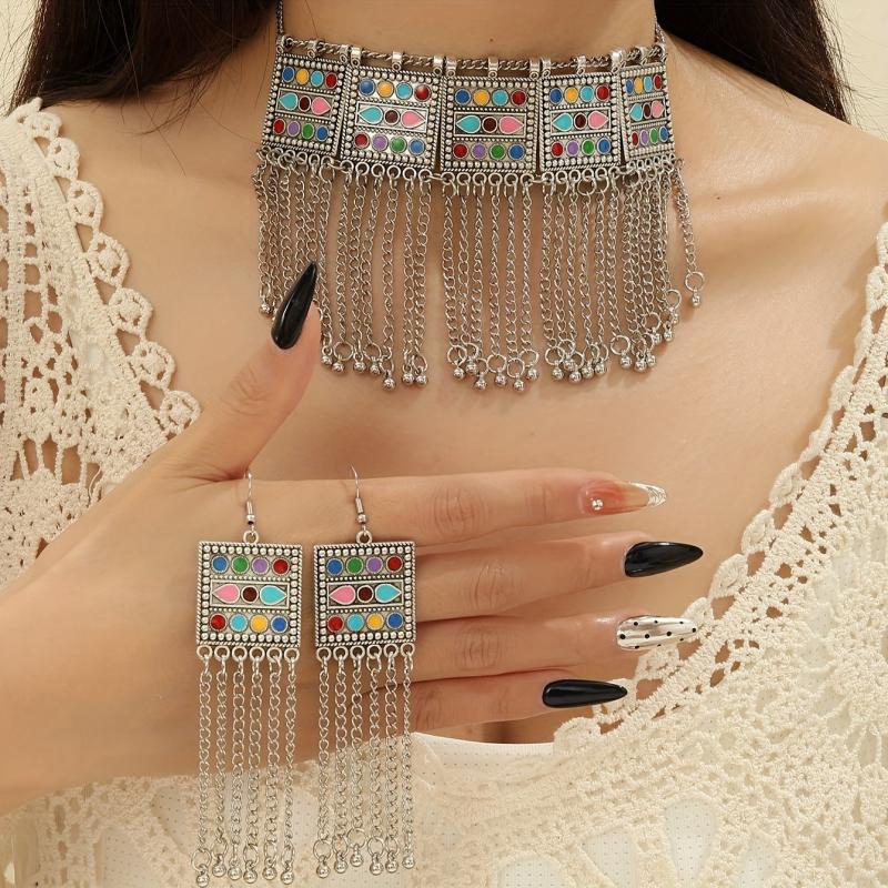 This elegant set includes a drop mixed tassel necklace and earrings, perfect for adding a touch of European and Bohemian style to your outfit. Ideal for travel or special occasions.
