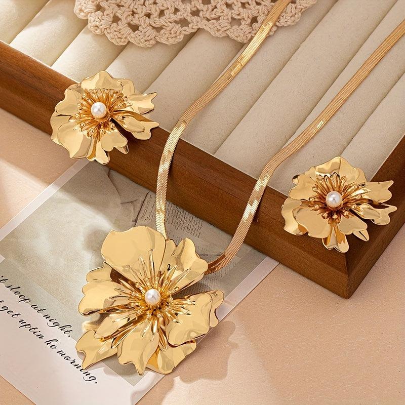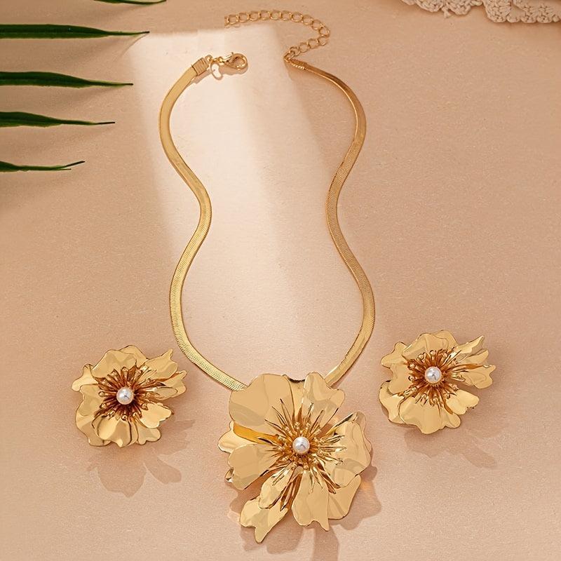 European Style Flower Pendant Necklace & Earrings Set Golden Metal Snake Chain