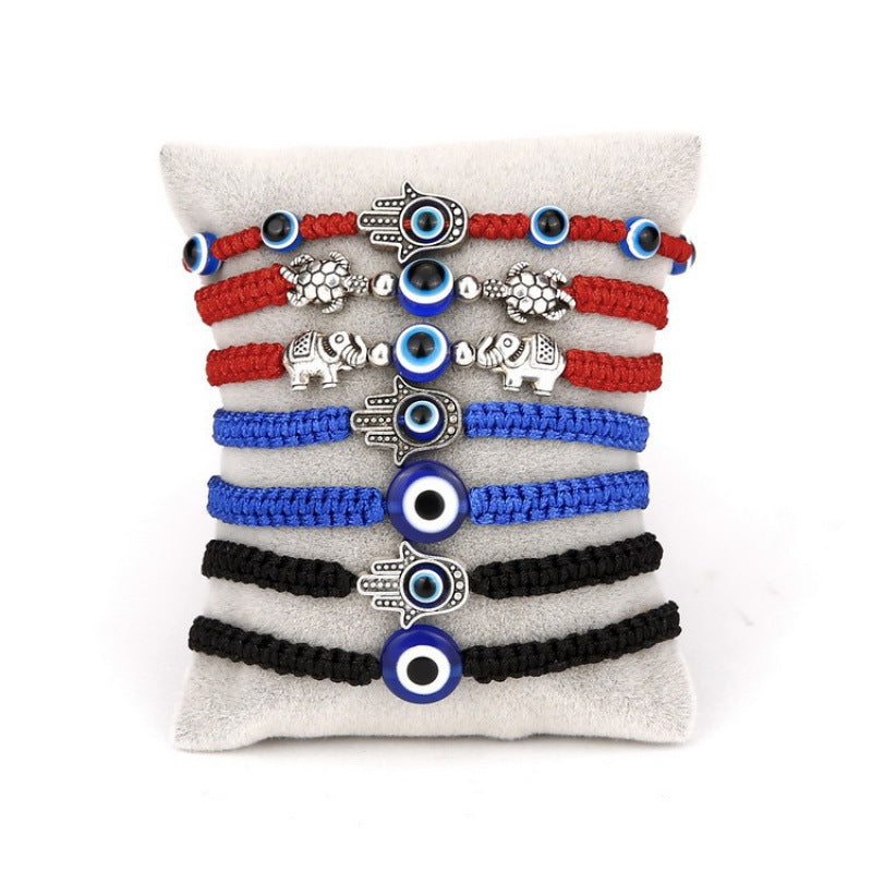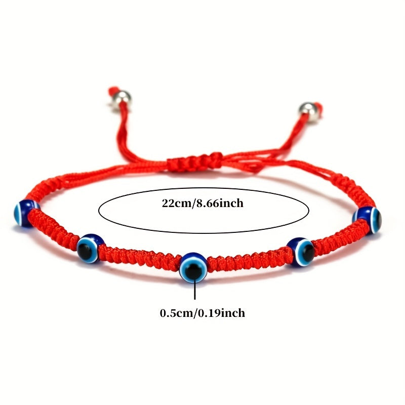 This adjustable bracelet features a Devil's Eye design with red rope woven around two round beads. It brings protection and good luck to the wearer.