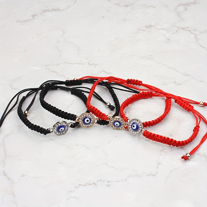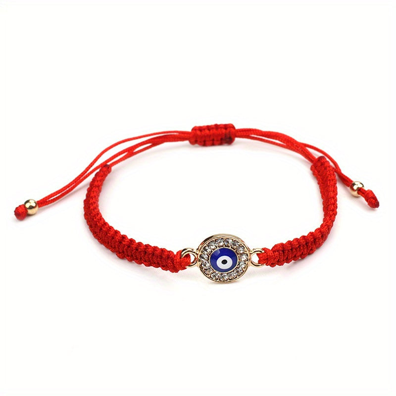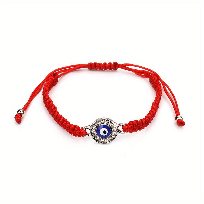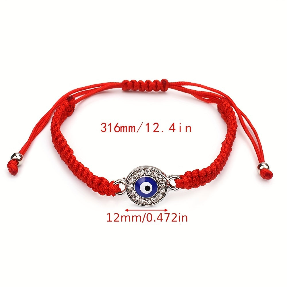 This braided rope bracelet features a striking evil eye design with rhinestones, perfect for both men and women. The red weave string adds a pop of color to your outfit, and the adjustable closure ensures a comfortable fit. Wear this lucky eye bracelet as a stylish accessory or as a symbol of protection.