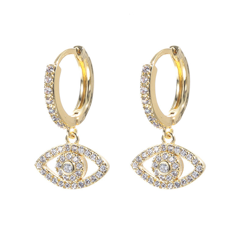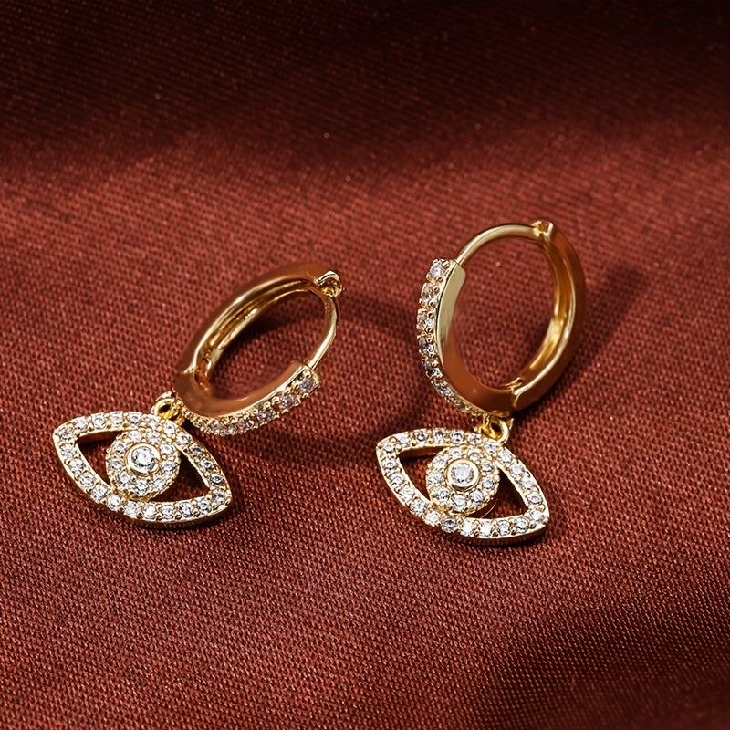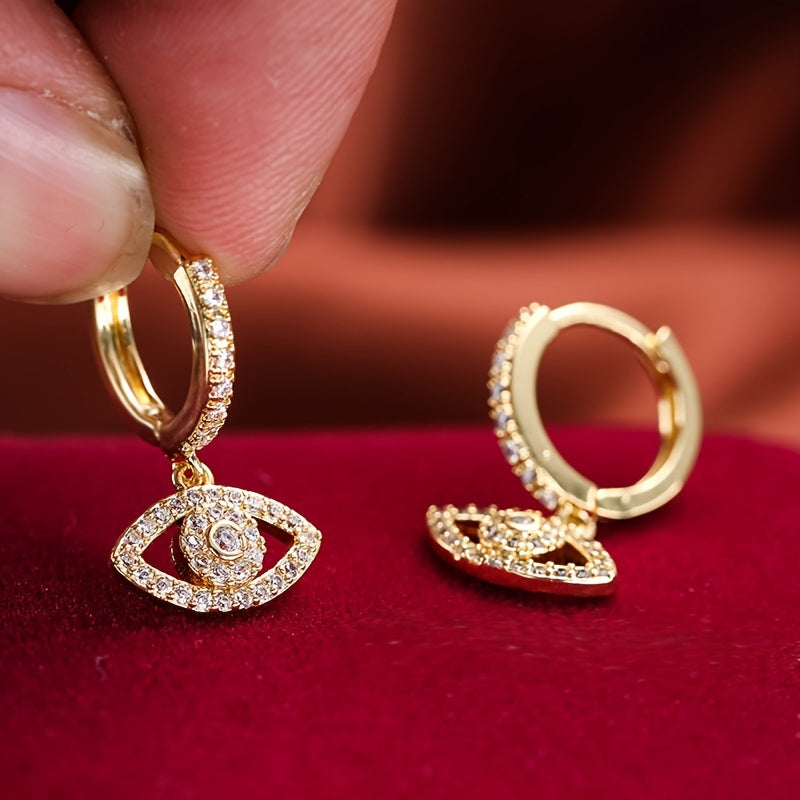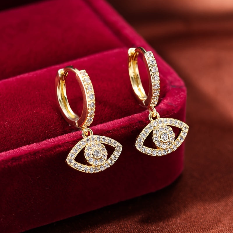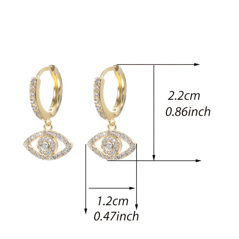 These delicate earrings feature inlaid zircon stones with an evil eye design. Perfect for holiday parties, these earrings are a stylish accessory for women and girls.