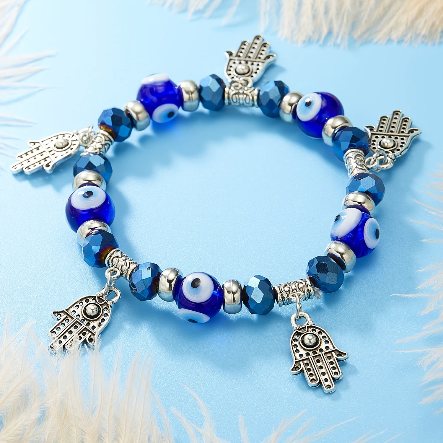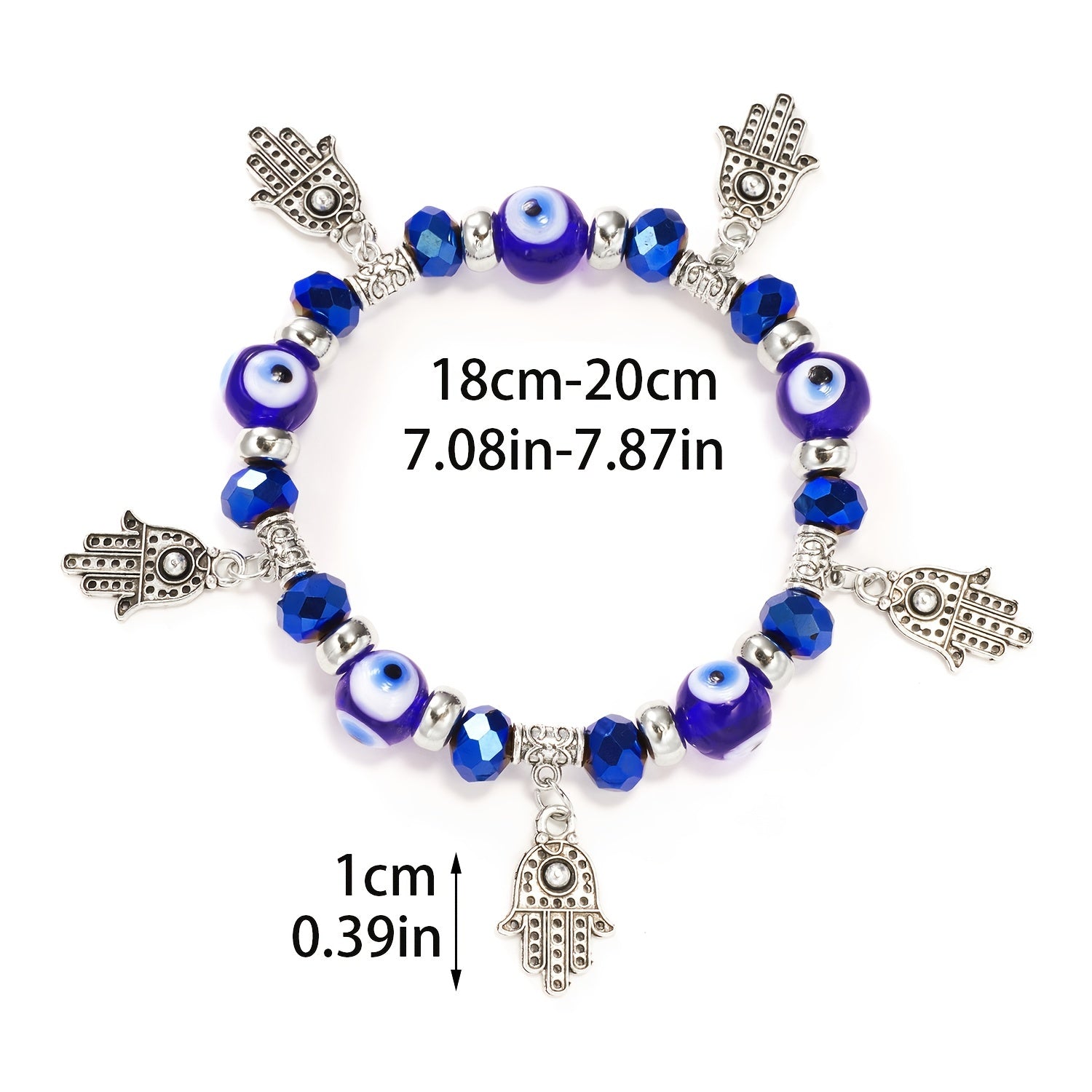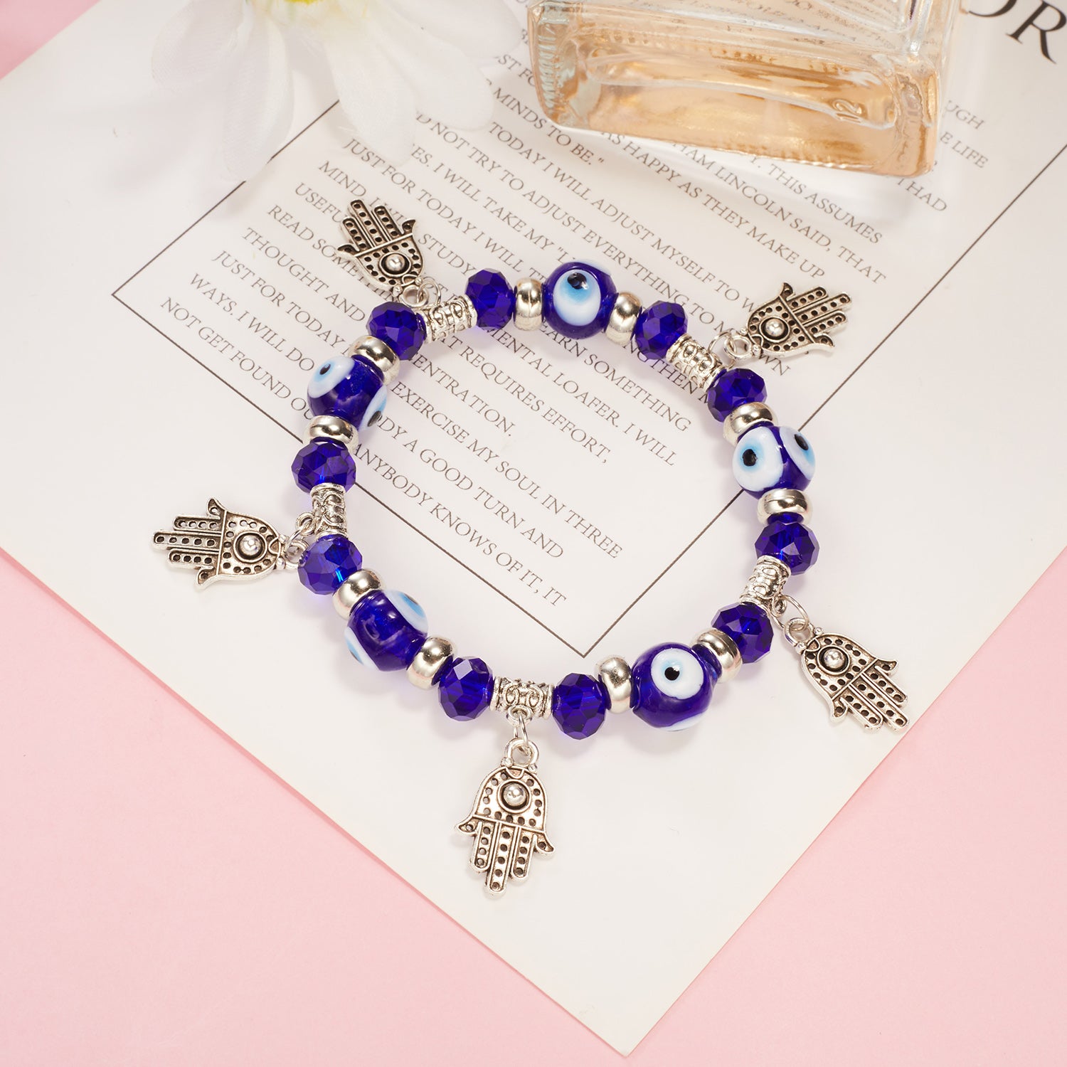 This bracelet features Evil Eyes bead palm pendant and crystal beads on an elastic band. It is stylish and versatile, perfect for everyday wear or special occasions.