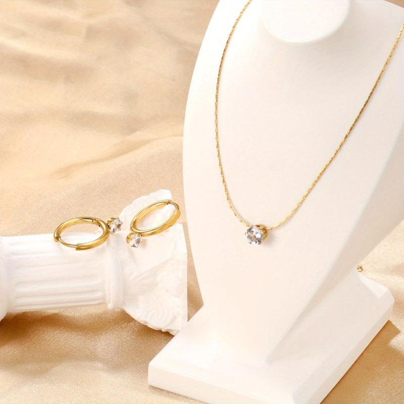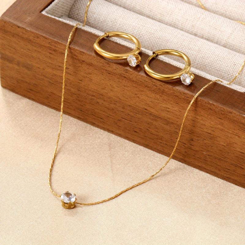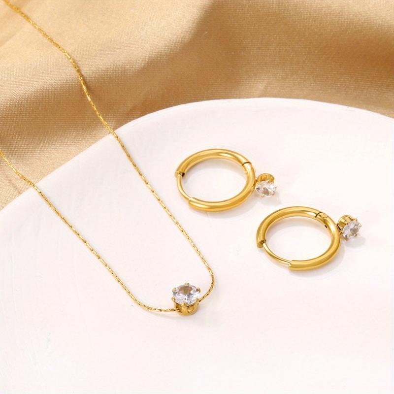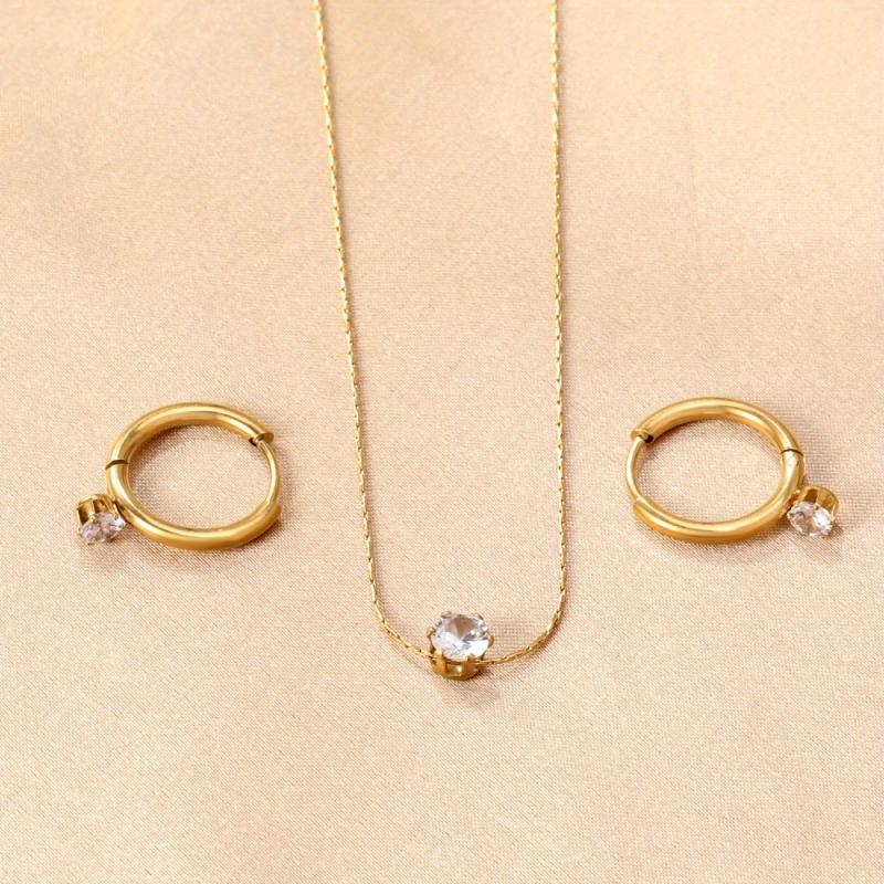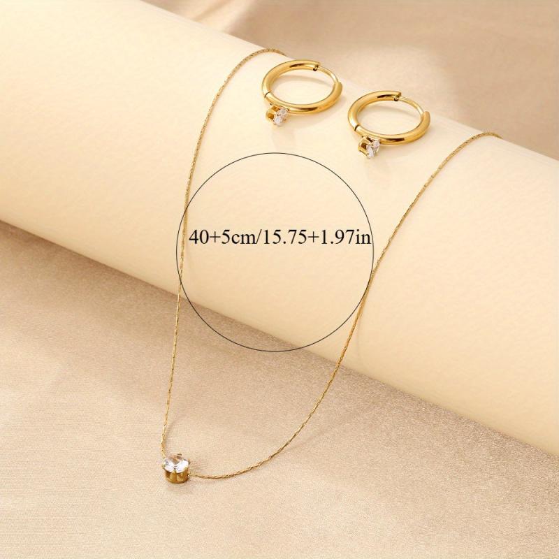 This set includes 3 stylish pieces with single inlaid rhinestone accents. Perfect for daily wear, these lightweight earrings and necklace will add a touch of elegance to your outfit.