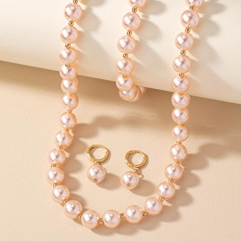 Complete your wedding look with this elegant jewelry set featuring faux pearl drop earrings, necklace, and bracelet. All pieces are 18k plated for a luxurious finish.