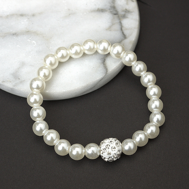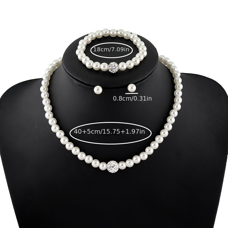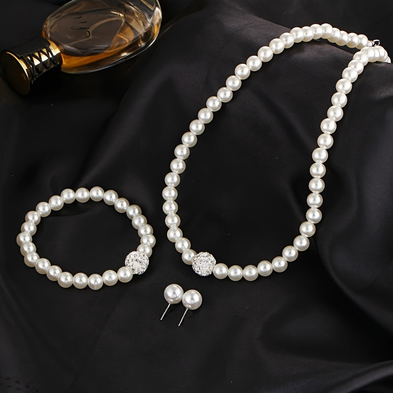 This stunning jewelry set includes a choker necklace, bracelet, and earrings adorned with sparkling faux pearls and crystals. Ideal for adding a touch of elegance to any outfit.