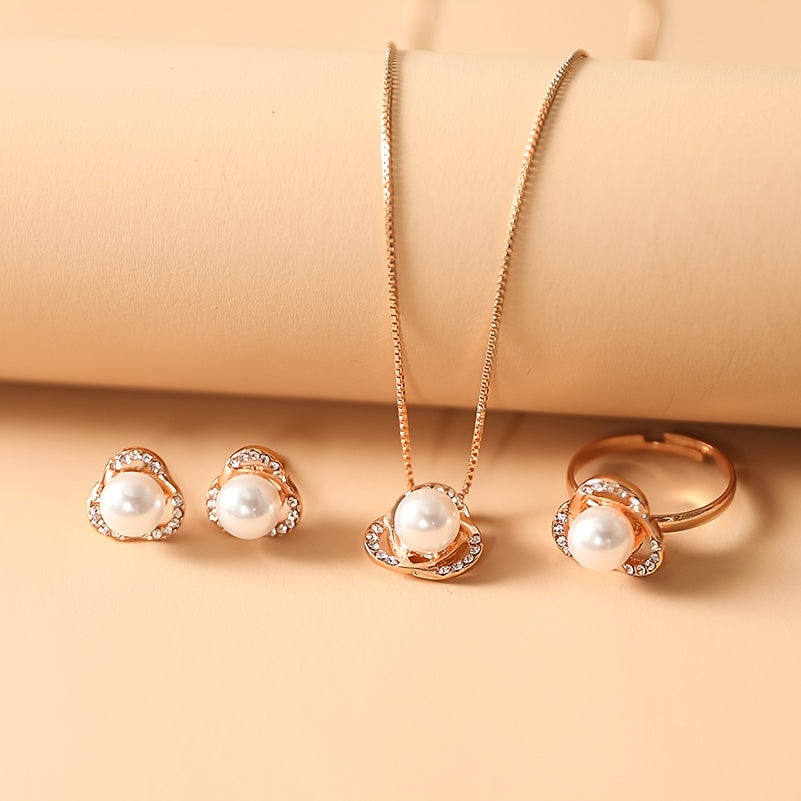This stunning jewelry set features inlaid faux pearls on a pendant necklace, stud earrings, and an open ring. Perfect for bridesmaids and brides to add a touch of elegance and sophistication to any outfit.