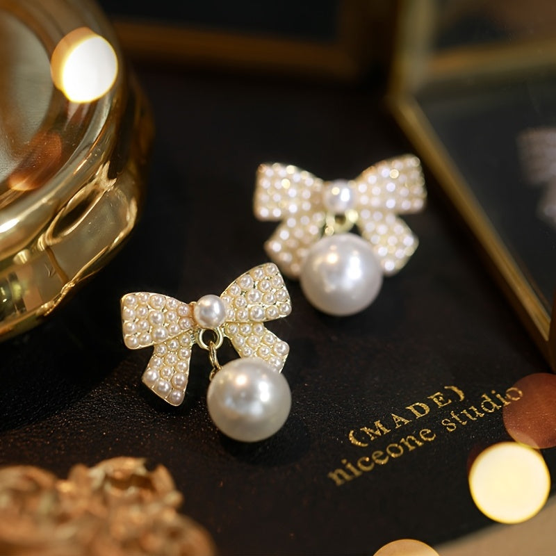 Add a touch of elegance to your look with these faux pearl stud earrings featuring a charming bowknot shape. Perfect accessories for women and girls.