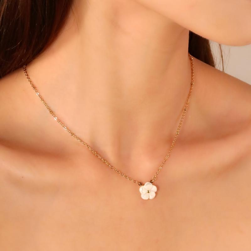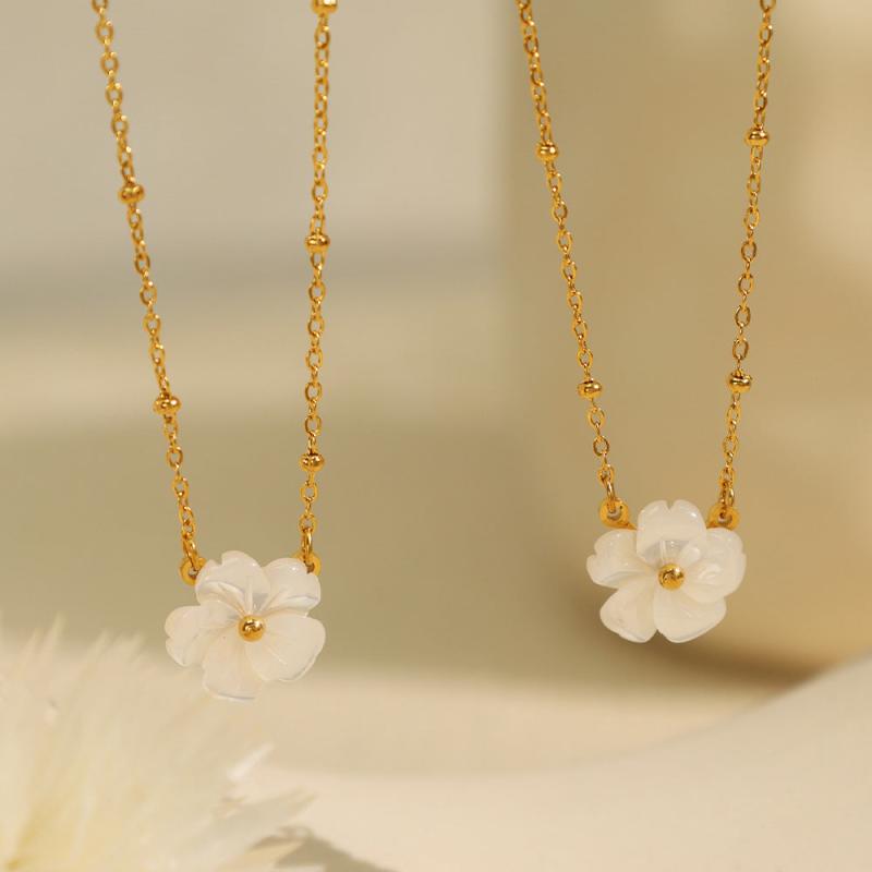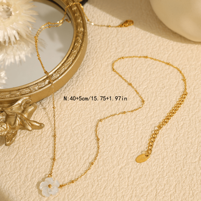 This stainless steel necklace features a delicate floral pendant adorned with golden tone beads. Perfect for daily wear, vacations, and holidays.