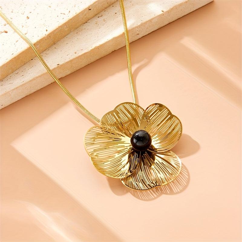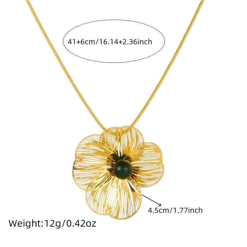 Add a touch of elegance with this floral pendant necklace featuring hollow petals. Crafted from stainless steel, this golden tone jewelry is perfect for women.