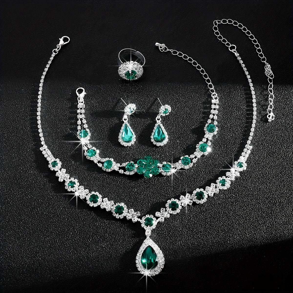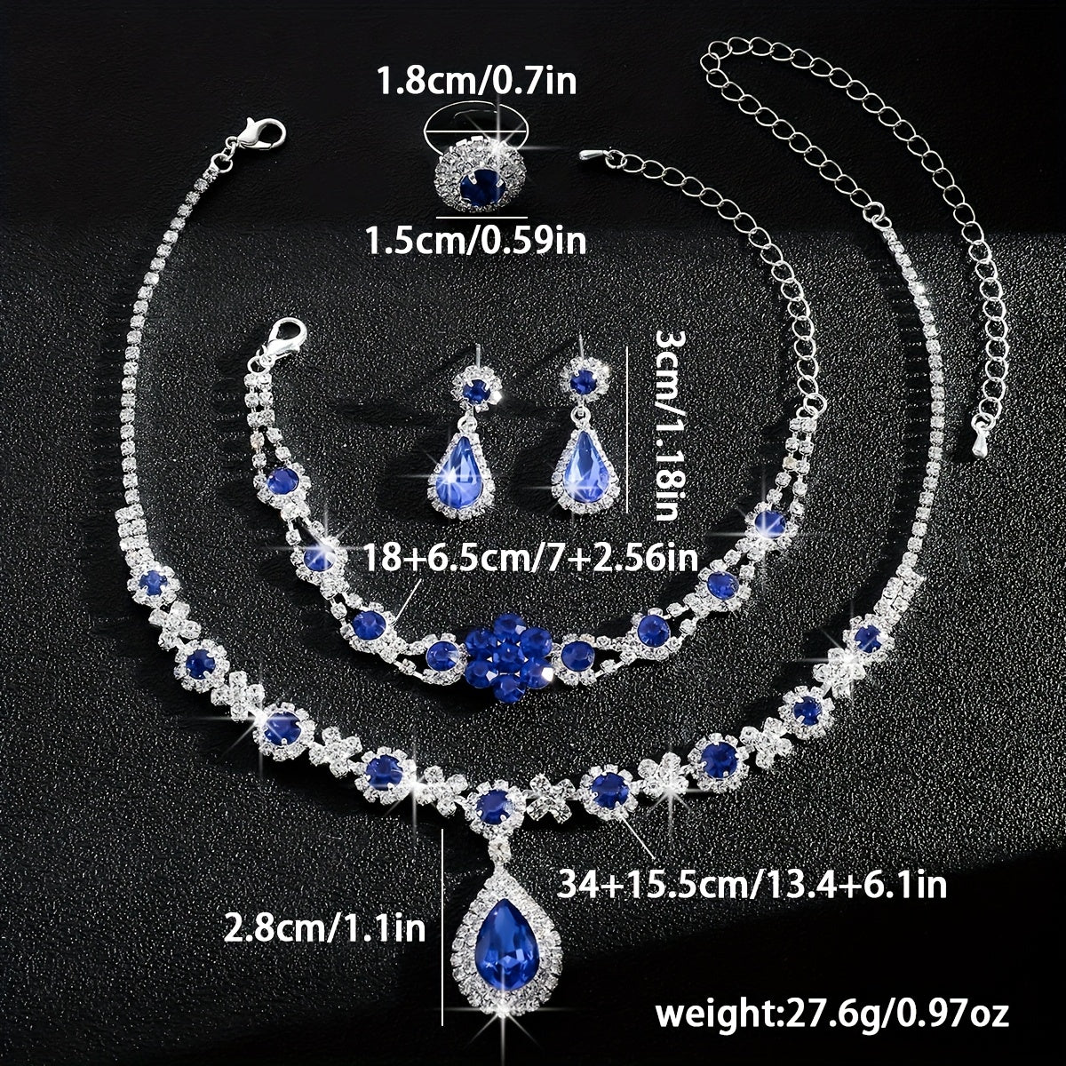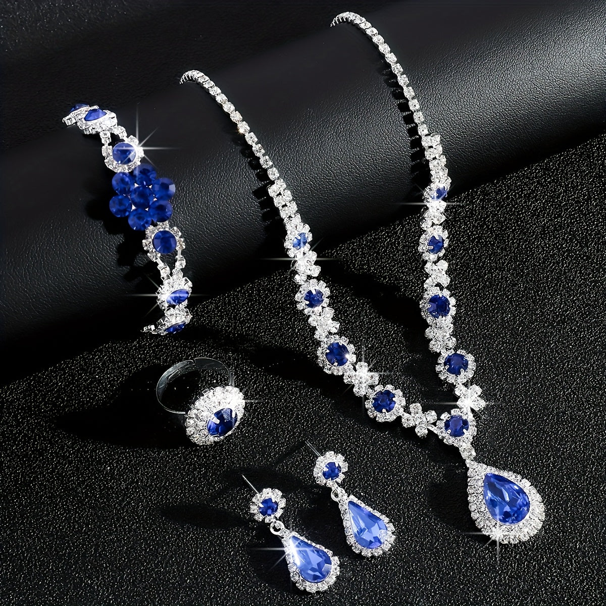 Complete your elegant look with this stunning set featuring a necklace, bracelet, earrings, and ring. Made with copper base and intricate floral teardrop design, accented with sparkling rhinestones. Perfect for weddings, photography sessions, and formal events.