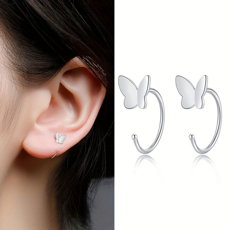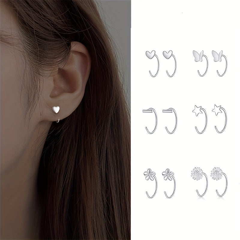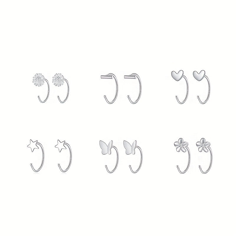 These minimalist style stud earrings feature a flower, heart, butterfly, and pentagram design. Made of copper with silver plating, they make a perfect gift for women.