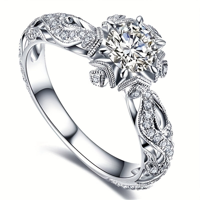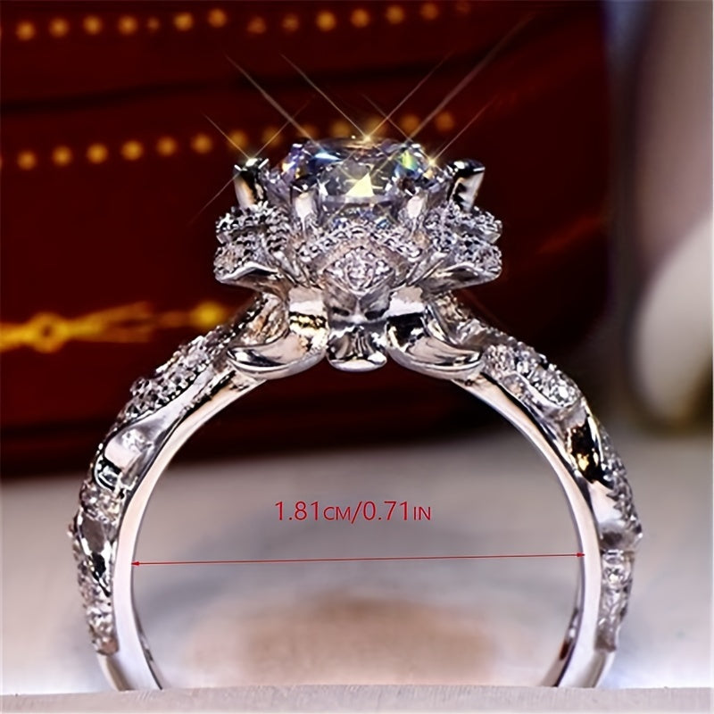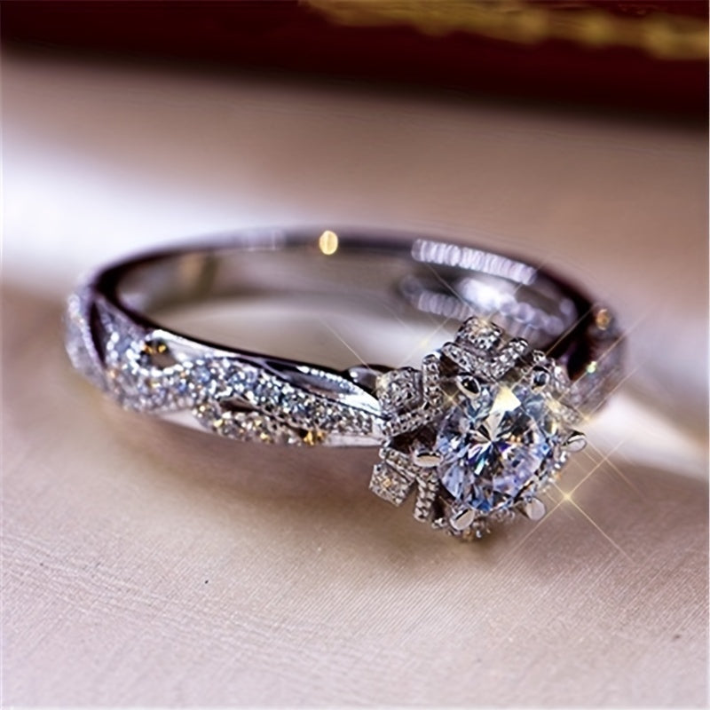 This elegant promise ring features a beautiful flower design with inlaid round cut zircon stones. Perfect for your loved one.