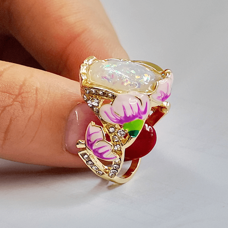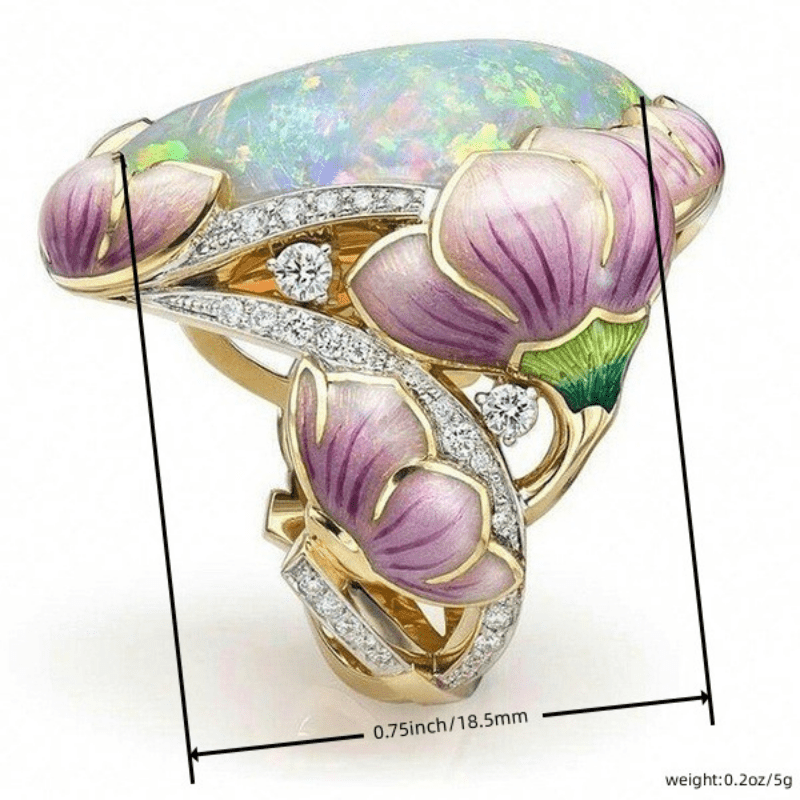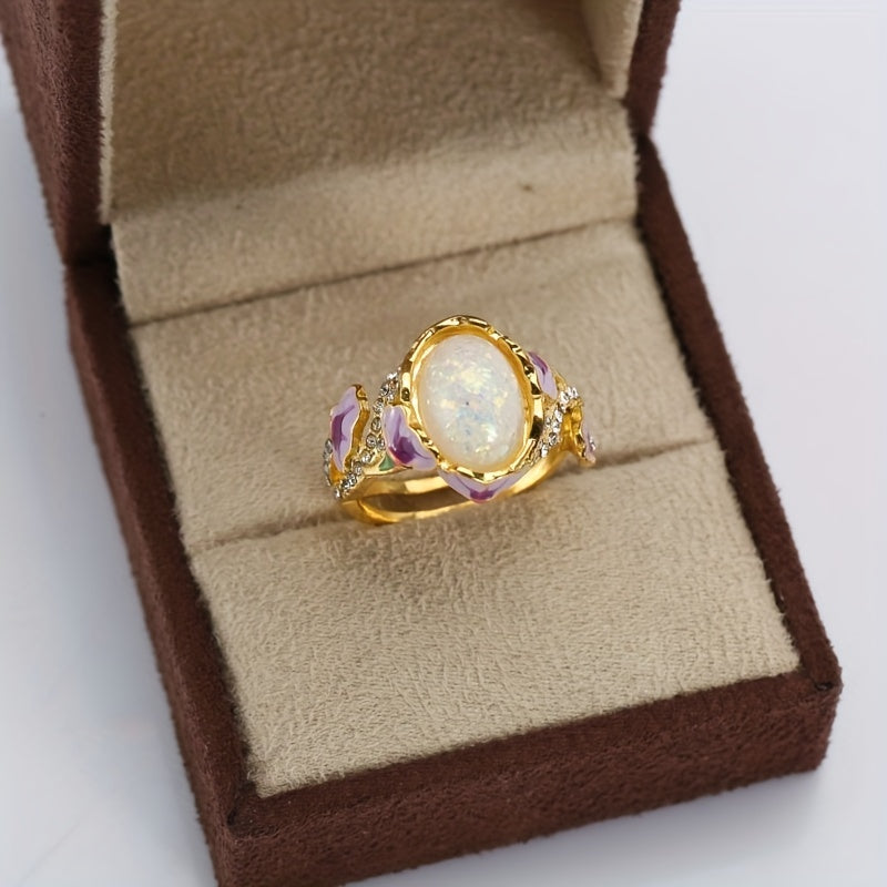 This stunning flower ring features inlaid zircon stones surrounding an opal egg shape center. The ring is plated with 14k gold for an elegant look.