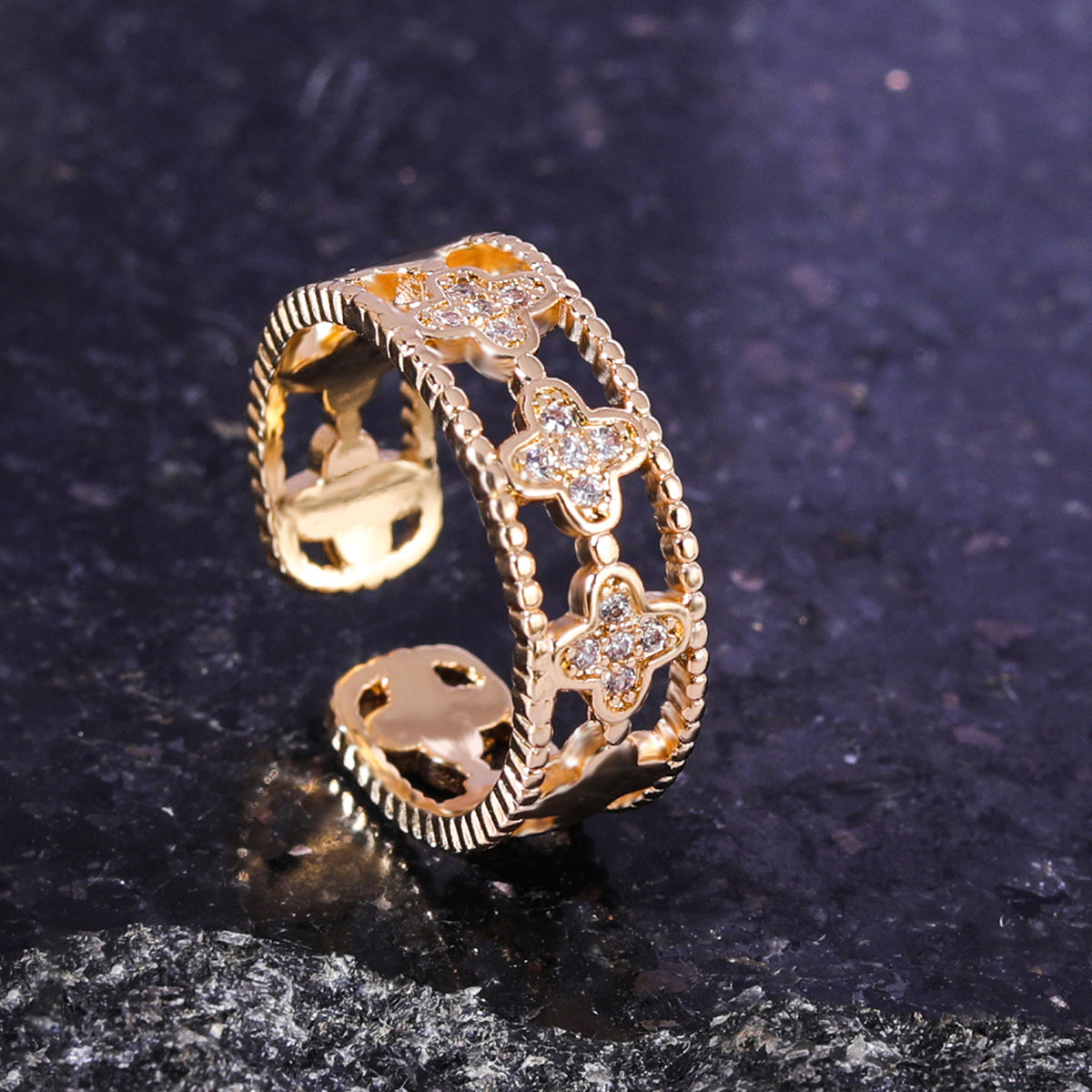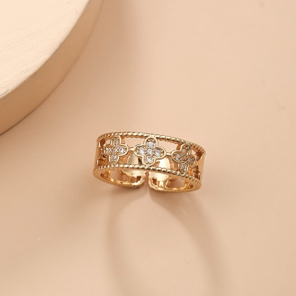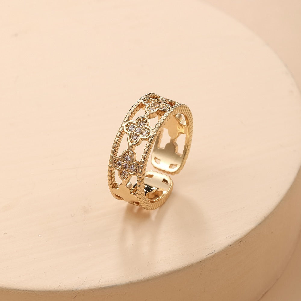 This stunning ring features a four-leaf clover design with sparkling zircon accents. A symbol of good luck and fortune, this ring is a charming addition to any jewelry collection.