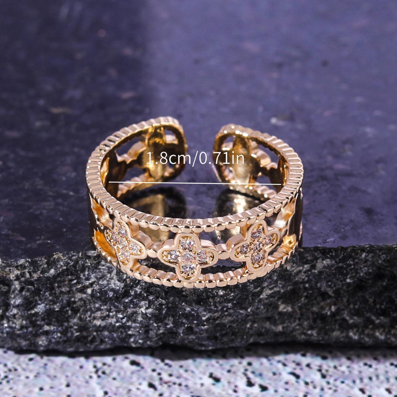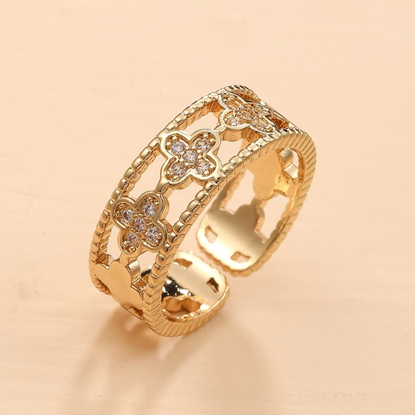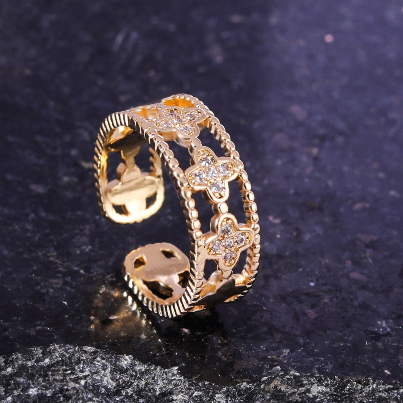 This stunning ring features a four-leaf clover design with sparkling zircon accents. A symbol of good luck and fortune, this ring is a charming addition to any jewelry collection.