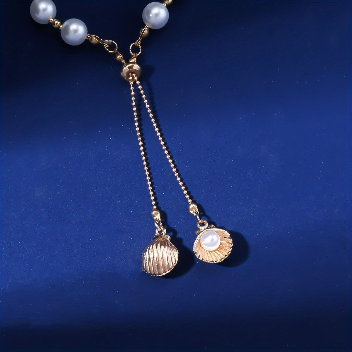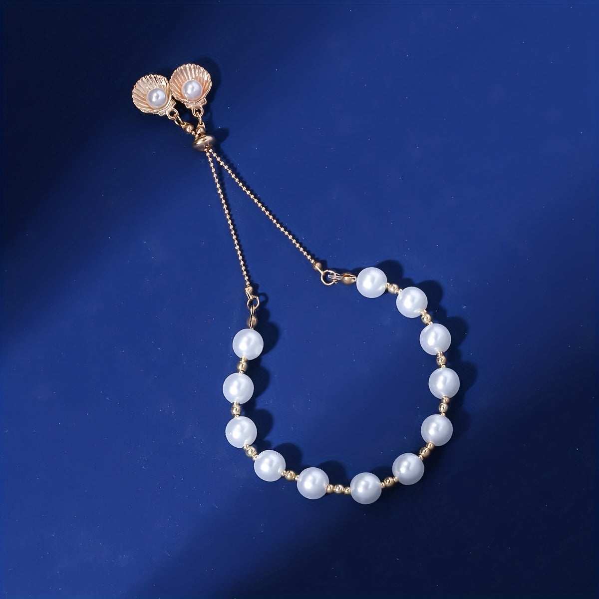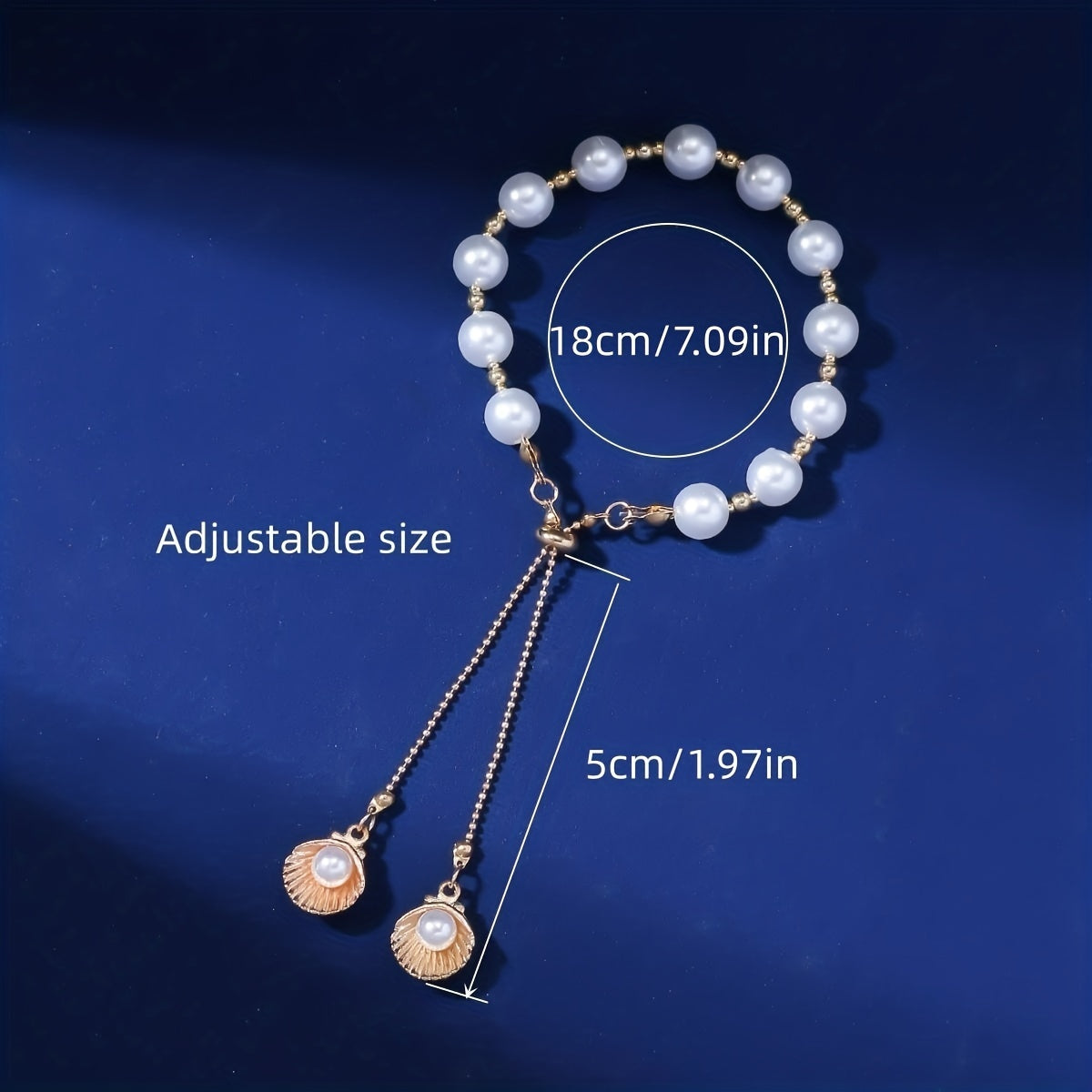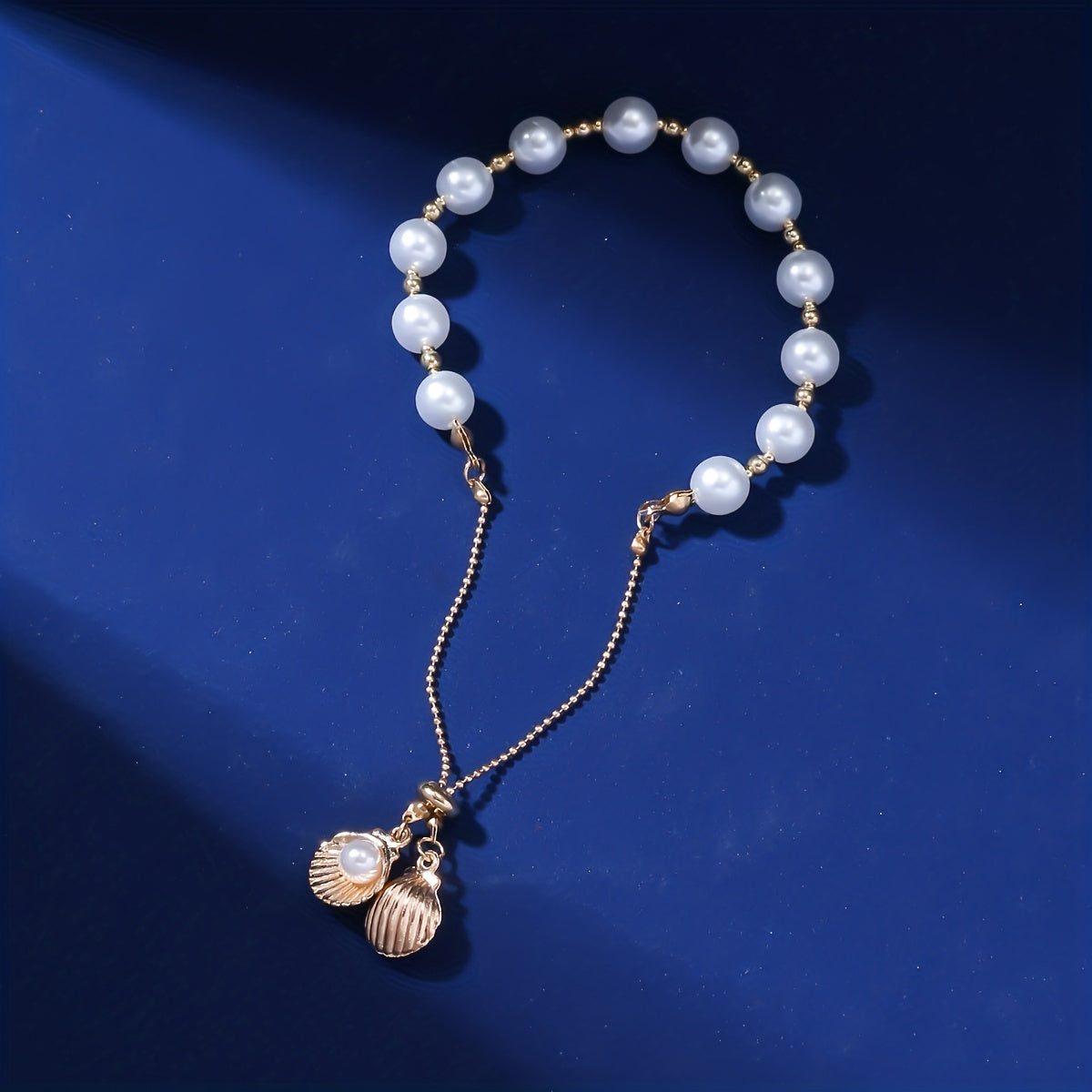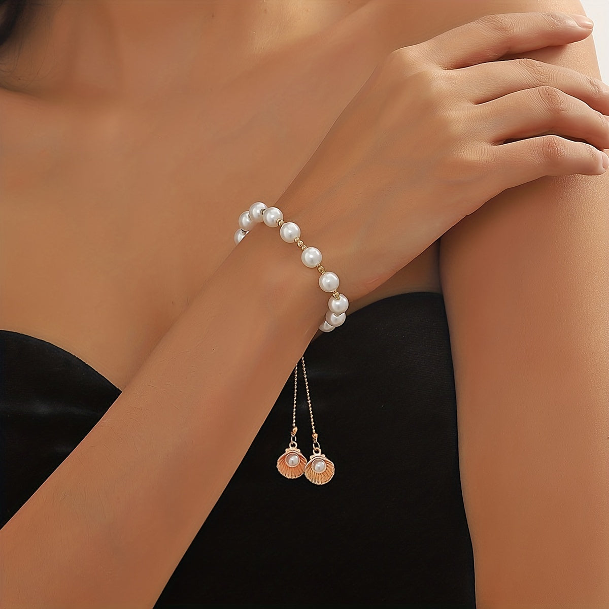 Add a touch of summer ocean beach style to your outfit with this elegant shell shape pearl bracelet. Perfect for any occasion.