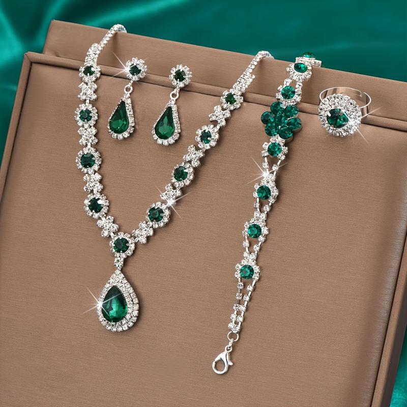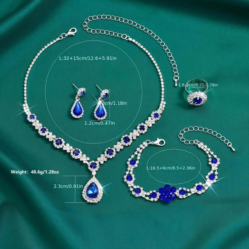 Complete your wedding ensemble with this stunning gemstone teardrop jewelry set. The set includes a necklace, earrings, and a bracelet, adding an elegant touch to your special day.