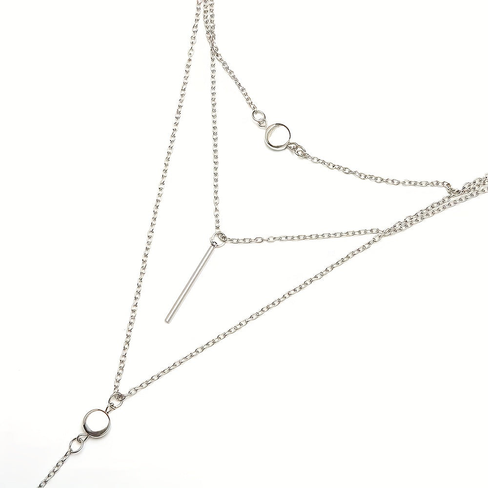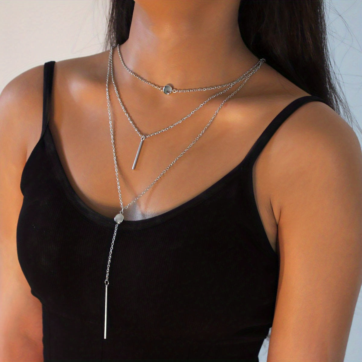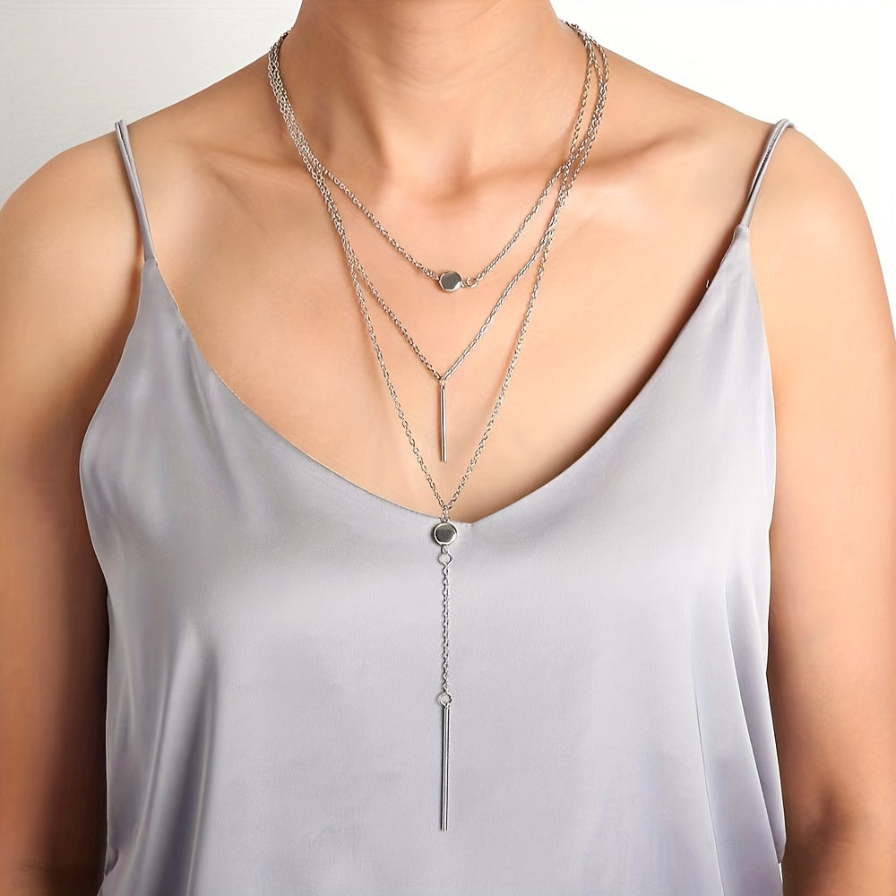Elevate your style with this unique multilayer geometric necklace featuring circular, long rod, and tassel design.